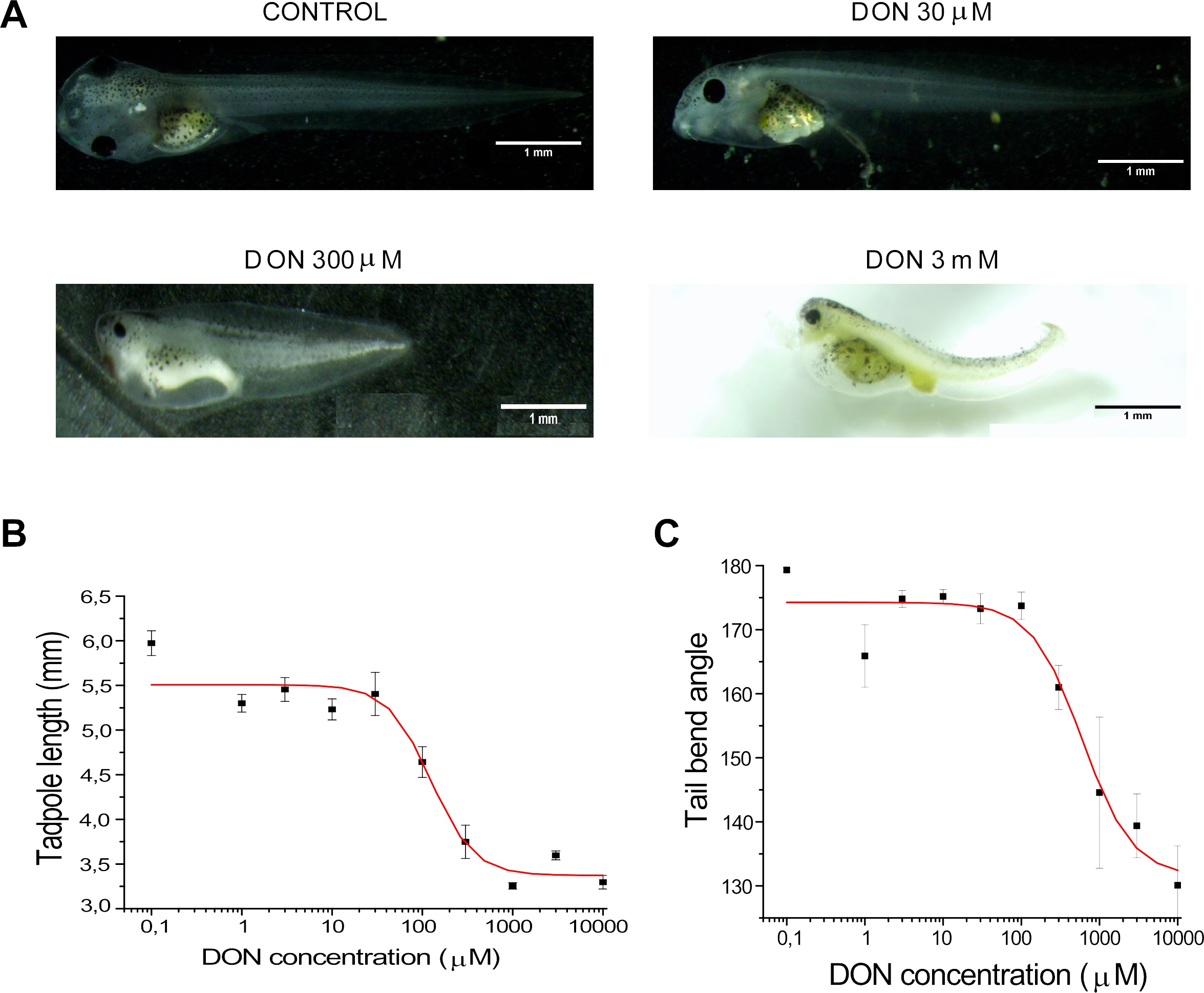 (B) Higher concentrations of DON result in a shortening of tadpole length. The maximal effect was obtained with 1 mM of DON (IC50 of 124 ± 35 µM).