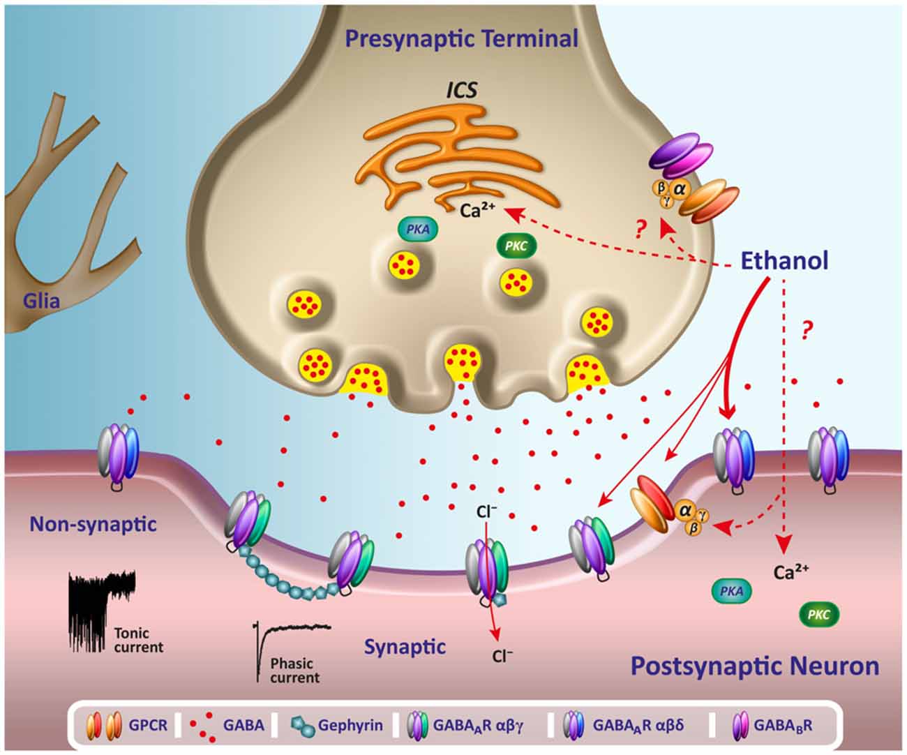 Figure 1. Acute effects of ethanol on GABAergic transmission. The scheme illustrates several potential acute pre and postsynaptic sites for the effects of ethanol on GABAergic neurotransmission. Reported changes on the release of presynaptic GABA might be mediated by changes on calcium release from intracellular calcium stores (ICS) following activation of G-protein coupled receptors (GPCR) or phosphorylation by protein kinase A (PKA) and C (PKC). Changes on the activation of GPCR, such as GABABR, could affect GABA release and alter the tonic Clâ current associated to non-synaptic GABAAR δ containing receptors through spillover of synaptically released GABA. At postsynaptic domains, acute low ethanol concentrations of alcohol appear to modulate primarily non-synaptic GABAAR (see thicker arrow) by a mechanism that might involve direct binding to the general anesthetics site of action or by intracellular signaling pathways, G protein, PKC and PKA or calcium release. The scheme also shows representative traces of a phasic current, activated by synaptic receptors, and a sustained small desensitizing tonic current, mediated by non synaptic receptors. |