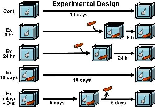 Figure 1. Experimental design for inducing predation in Xenopus tadpoles. Xenopus tadpoles were assigned to 5 different treatment groups. The control group (Cont) was not exposed to the salamander predator during the experiment (10 days). Tadpoles in the 6 h and 24 h groups were exposed to a salamander larva for 6 or 24 h before sampling, respectively. The 10-day group was exposed to a salamander larva for 10 full days, while the 5-days out group was exposed to a salamander larva for 5 days, to induce the predation threat, then the salamander was removed, and the tadpoles were kept for a further 5 days without the predation threat. |