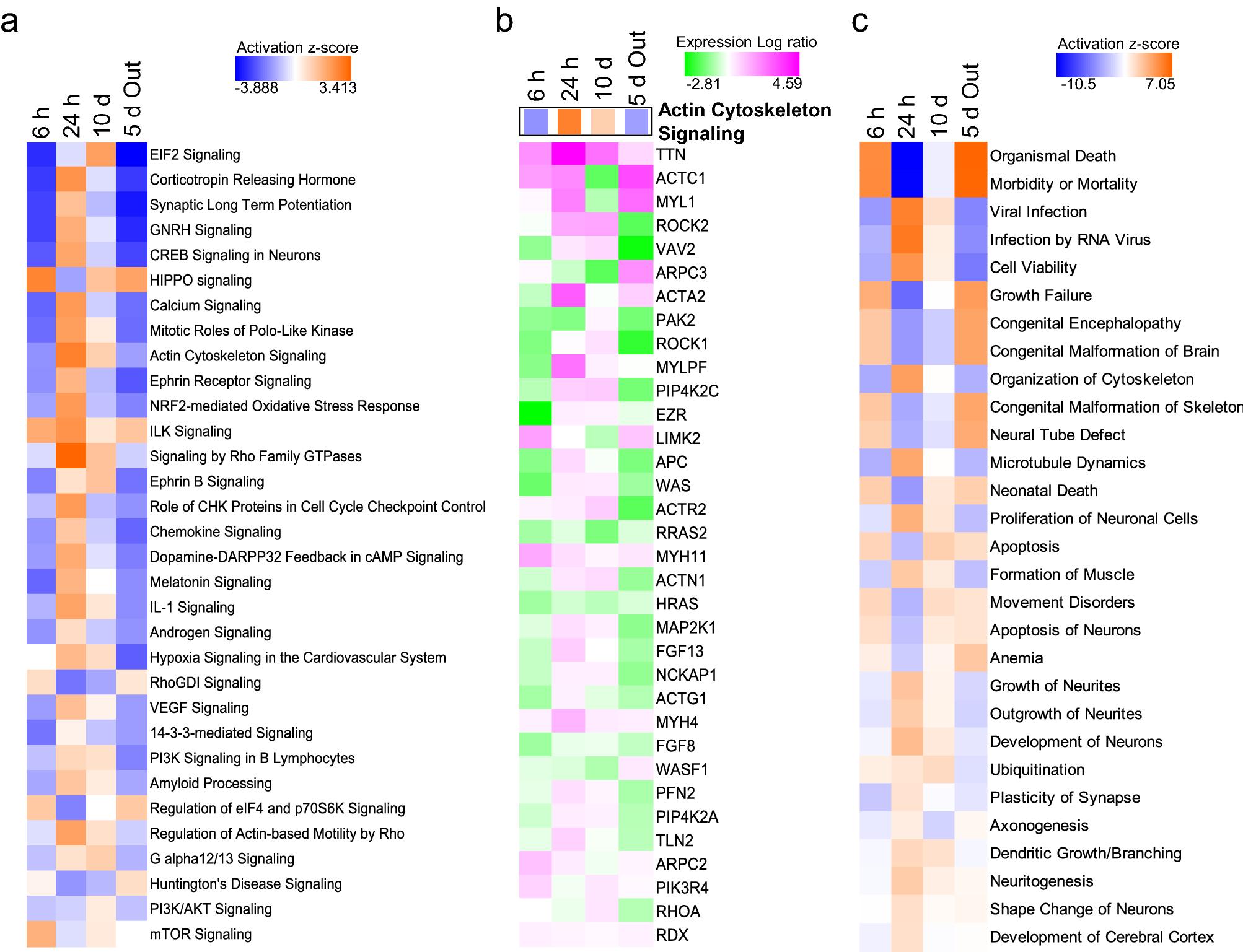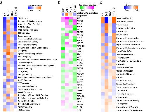 Figure 3.Ingenuity pathway analysis (IPA) of the expressed genes induced in the Xenopus laevis whole brain by the threat of predation. Heat map of the altered signal transduction pathways in each treatment group. The number of expressed genes after 6 h (6 h of exposure to a predation threat) were divided by those of the Cont (no exposure to a predation threat) and used to predict the altered signal transduction pathways. 24 h (24 h exposure to a predation threat), 10 days (10 days exposure to a predation threat), and 5 days out (5 days exposure to a predation threat, followed by five days of no threat) also indicate the altered signal transduction pathways compared with that of the Cont, respectively. (a) Heat map of the genes expressed in the actin cytoskeleton signaling. Genes involved in actin cytoskeleton signaling were obtained from the IPA, and the levels of expressed genes in each treatment group were compared with that of the Cont. Panels surrounded by the black rectangles, indicate the degree of actin cytoskeleton signaling from (a). The gene symbols and corresponding Entrez Gene Names in (b) are given in Supplementary Table 4. (b) Disease and function predicted by the analysis of the total signal transduction pathways. The prediction was performed by IPA using the expressed genes compared with those of the control. The displayed diseases and functions are restricted to the top 29 results. |