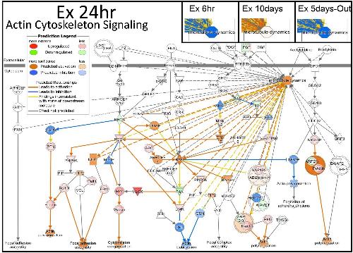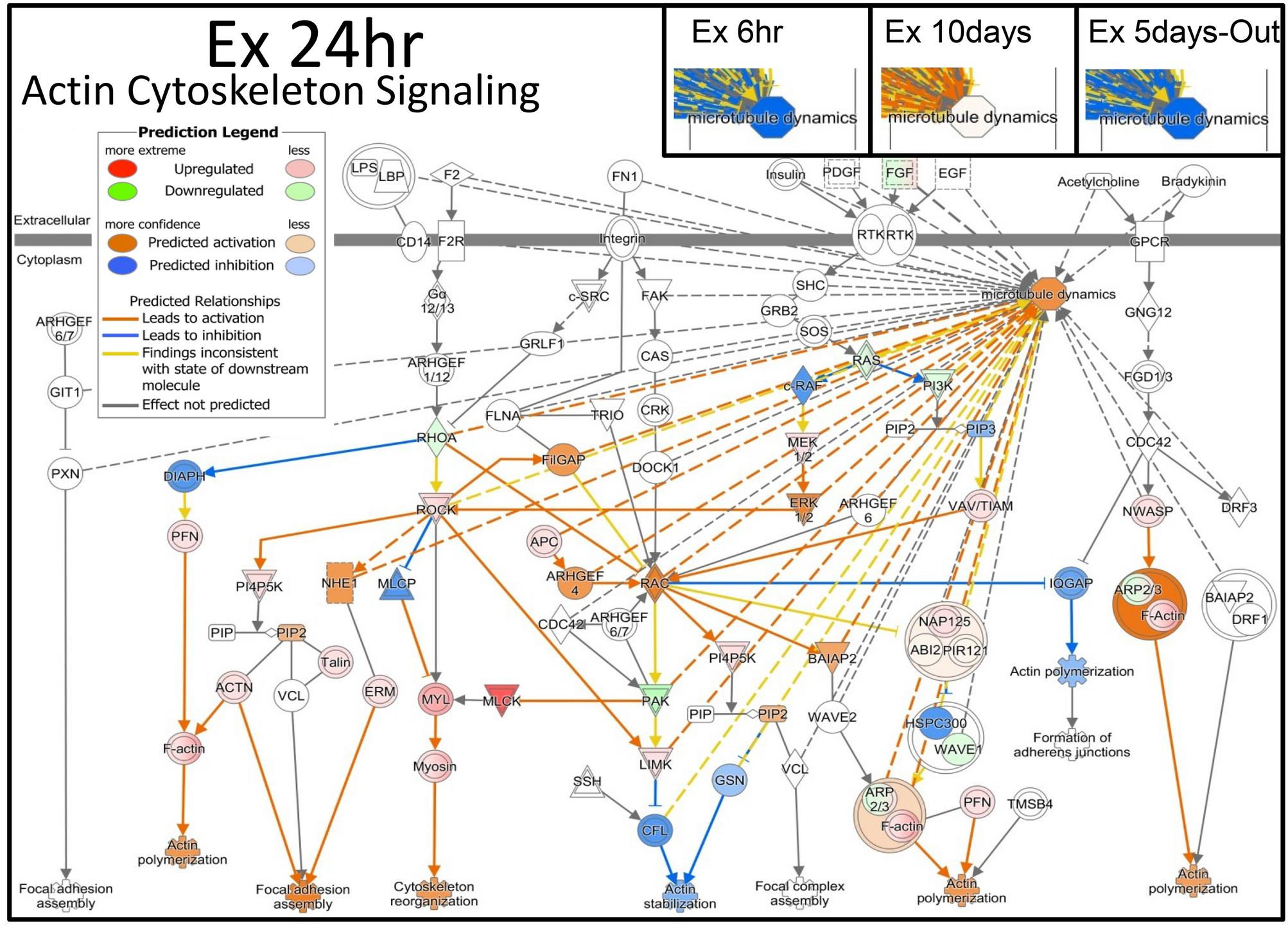 Figure 4. Ingenuity pathway analysis (IPA) of actin cytoskeleton signaling in the Xenopus laevis whole brain after exposure to the predatory salamander larva, Hynobius lichenatus. Actin cytoskeleton signaling after 24 h of predation (24 h group). The microtubule dynamics shown in the boxes labeled Ex6hr (after 6 h of predation), Ex10days (after 10 h of predation), and Ex5days-Out (after 5 days of predation, followed by 5 days with no predation) in the top right corner, were predicted from the actin cytoskeleton signaling. The microtubule dynamics in Ex24hr were predicted to be up regulated in the signal transduction map. Blue indicates downregulation and orange indicates upregulation of the microtubule dynamics, compared with the control. The predictions were performed using two statistical measures, an overlapping pâvalue, and an activation z-score, that were computed for each potential transcriptional regulator. This figure was created using Ingenuity pathway analysis (IPA) version 2.1, QIAGEN; (https://www.qiagenbioinformatics.com/products/ingenuitypathway-analysis). |