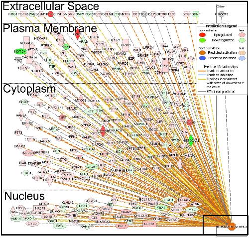 Figure 5. All genes involved in the microtubule dynamics in Xenopus laevis, as determined by RNA-seq after 24 h of exposure to a predation threat from the larval salamander Hynobius lichenatus (24 h group), in comparison to the control which was not exposed to a predation threat. The black rectangle indicates the microtubule dynamics. This figure was created using Ingenuity pathway analysis (IPA) version 2.1, QIAGEN; (https://www.qiagenbioinformatics.com/products/ingenuitypathway-analysis).