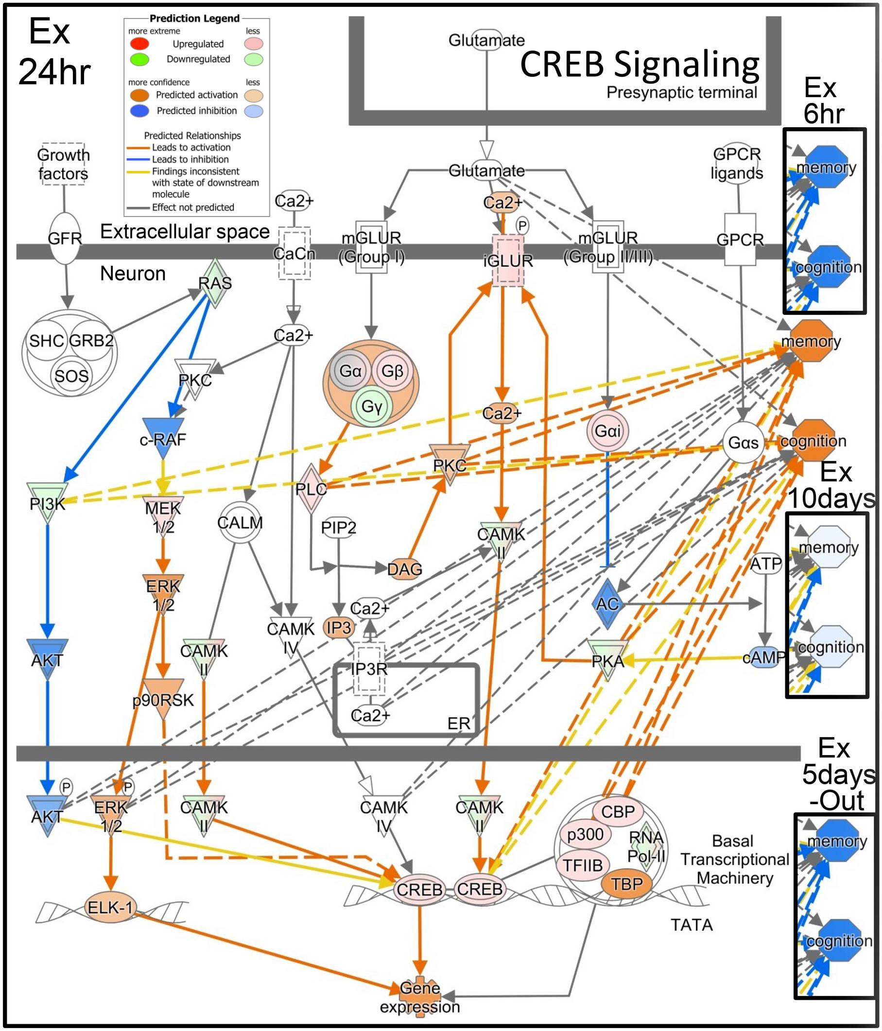 Figure 6. CREB signaling in the Xenopus laevis whole brain after exposure to 24 h of a predation threat from the larval salamander, Hynobius lichenatus. Changes in the memory and cognition pathways were predicted using the Ingenuity pathway analysis and compared to the controls (not exposed to predation) for the expressed genes in each treatment group. The degree of memory and cognition for Ex6hr (exposed to predation for 6 h), Ex10days (exposed to predation for 10 days), and Ex 5 days-Out (exposed to predation for 5 days, and then 5 days without), are shown in the right-hand side panels. |
