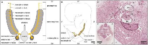 Fig. 1. Organization of kidney development. A) Diagram illustrating the three sets of excretory structures as supposed to be present in a human embryo during the fifth week (about 32 days, Carnegie stage 14) (after Moore 1988). Cr, cranial; Ca, caudal. B) Reconstruction of the urogenital system of a stage 16 human embryo specimen 6517 (37–42 days), including meso- and metanephros and their ducts (de Bakker et al. 2016). Cr, cranial; Ca, caudal; D, dorsal; V, ventral. C) Section through the mesonephric region of a stage 17 human embryo specimen 6521 (42–44 days). D, dorsal; V, ventral. D) Enlarged part of the section in C. A, arteriole; BC, Bowman’s capsule; C, coelom; D, mesonephric duct; G, gonad; GL, glomerulus; L, liver; MB, Malpighian body; PV, postcardinal vein; T, mesonephric tubules; V, vein. |