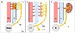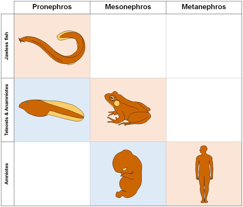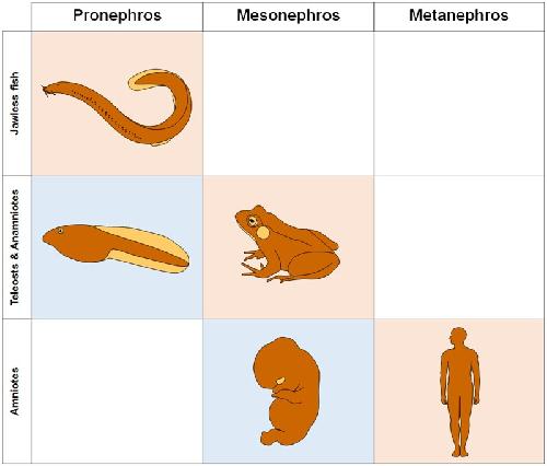 Fig. 7. General concept for renal evolution. Vertical columns: different kidney forms (i.e., pro-, meso-, and metanephros). Horizontal rows: different classes of species. In most jawless fish, like Amphioxus and hagfish, the pronephros remains functional through adulthood, often alongside a functional mesonephros. Larvae of teleosts and anamnia (e.g., tadpoles) generally pass a pronephric stage, while adult specimens (e.g., frogs) use a mesonephros for secretion. Embryos of amniotes (e.g., humans) do not pass a pronephric stage, but do use the mesonephros during the embryonic phase and the metanephros through fetal development, in childhood and in adulthood. The used kidney form thus gradually shifts from simple pronephric kidney as used by adult jawless fish, via the intermediate mesonephric kidney in more basal vertebrates toward the intricate metanephric kidney as used by more advanced vertebrates. |