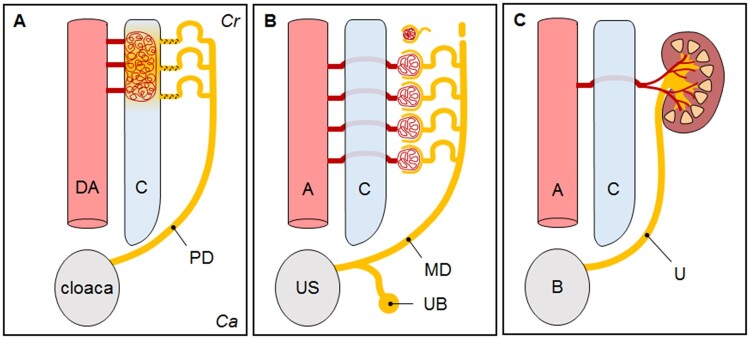 Fig. 2. Schematic drawings of pro-, meso-, and metanephros. A) Schematic drawing of the non-integrated nephron of a pronephros in frogs. The glomus, a single glomerular unit that is formed over two to three body segments and later becomes more compact, is supplied by arterial sprouts from the dorsal aorta and filters wastes directly in the fluid of the coelomic cavity (Gerth et al. 2005). The glomus is not integrated in the tubules but it lies in the immediate vicinity of them, so there is almost no space between the glomus and nephrostomes. These ciliated nephrostomes collect the coelomic fluid and the primitive urine will be collected through the pronephric tubules via the pronephric duct into the cloaca. See also Fig. 3A. B) Schematic drawing of the integrated nephrons of a mesonephros. The glomeruli are supplied by arterial sprouts from the aorta that pass behind the coelom and filter wastes into Bowman’s cavities. The glomeruli are therefore integrated in the tubules. The collected wastes are transported through the mesonephric tubules toward the mesonephric duct and collected in the urogenital sinus. See also Fig. 3B. The ureteric bud which initiates metanephric development and will become the ureter is an outgrowth of the mesonephric duct. The cranial-most metanephric nephrons degenerate over time. Note that these degenerated nephrons have often been wrongly described as pronephric. C) Schematic drawing of a metanephros and its supplying renal artery are situated retro-peritoneal, so dorsal of the coelom. The metanephric nephron with its Bowman’s space and extensive tubule is firmly embedded within the renal cortex and renal pyramids (lighter triangles). Urine is collected in the renal pelvis and transported through the ureter toward the bladder. A, aorta; B, bladder; C, coelom; Ca, caudal; Cr, cranial; DA, dorsal aorta; PD, pronephric duct; US, urogenital sinus; U, ureter; UB, ureteric bud; MD, mesonephric duct. |
