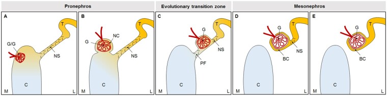 Fig. 4. Different manifestations of pronephric and mesonephric nephrons. The non-integrated nephrons in A and B are purely pronephric as the external glomerulus or glomus hangs freely in the coelom (A) or nephrocoel (B). The integrated nephrons in D and E are typical mesonephric because the connection with the coelom is lost and the internal glomerulus is enclosed by Bowman’s capule. The nephron in C, which includes both a peritoneal funnel (PF) and a nephrostome (NS), has been regarded by Vize as mesonephric (Vize et al. 2003). However, to avoid ambiguity we suggest to refer to these nephrons as intermediate nephrons. The region in which these nephrons are found has been called the evolutionary transition zone (ETZ) by multiple authors (Fraser 1920; Davies 1950; Sedgwick 1881; Renson 1883; Mihalkovics 1885; Hiruma and Nakamura 2003), since the glomerulus is still in contact with the coelom (a typical pronephric feature) and the PF has been regarded both pronephric (Fraser 1950; Davies 1951; Hamilton et al. 1972) as mesonephric (Vize et al. 2003). This intermediate type of nephron might actually represent the gradual evolutionary change from pronephros to mesonephros (Wiedersheim 1890; Davies 1950; Hiruma and Nakamura 2003). C, coelom; G, glomerulus; G/G, glomerulus/glomus; L, lateral; M, medial; NS, ciliated nephrostome, which links the coelom or nephrocoel with the proximal tubule; PF, ciliated peritoneal funnel, which links the coelom to the encapsulated glomerulus (primitive Bowman’s capsule); T, tubule. |