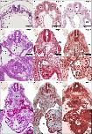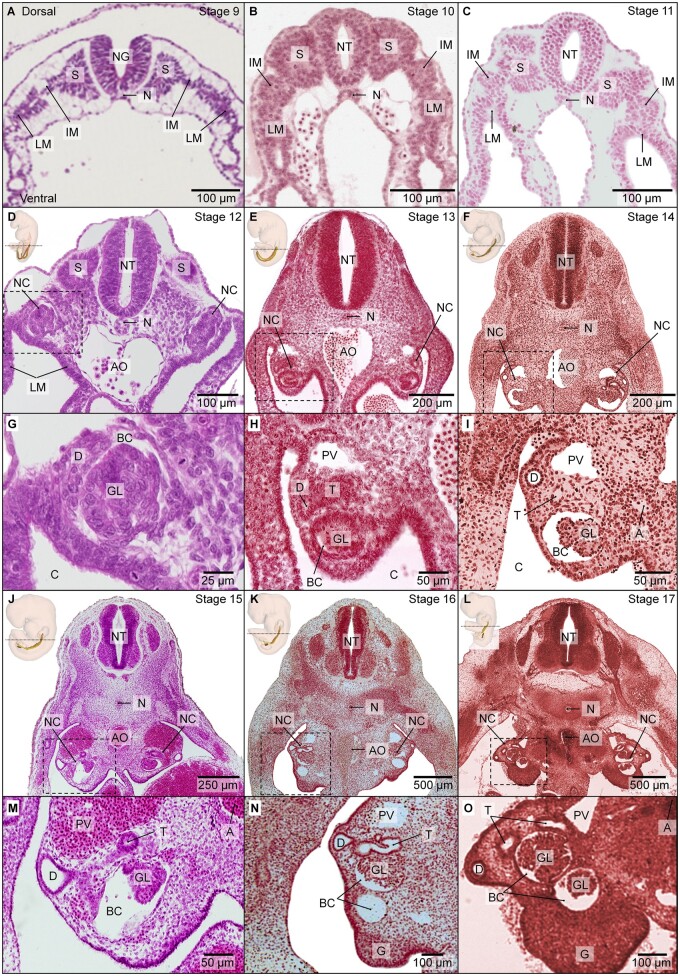 Fig. 5. Histological features of human nephrogenic development. A) Transverse section through the caudal region of a stage 9 (26–30 days) human embryo specimen H712. The intermediate mesoderm (IM) is still hard to discern from somite (paraxial mesoderm) and lateral plate mesoderm (LM) B) Transverse section through the caudal region of a stage 10 (21–23 days) human embryo specimen 5074. The intermediate mesoderm is recognizable as a clump of undifferentiated mesenchymal cells. C) Transverse section through the caudal region of a stage 11 (23–26 days) human embryo specimen 6344. The intermediate mesoderm is still undifferentiated. D) Transverse section through the caudal region of a stage 12 (26–30 days) human embryo specimen 8943. The nephrogenic cord (NC) is now present. E) Transverse section through the mesonephric region of a stage 13 (28–32 days) human embryo specimen 836. Fig. 5 F) Transverse section through the mesonephric region of a stage 14 (31–35 days) human embryo specimen 6502. G) Enlarged part of the section in D. A very primitive glomerulus is recognizable, surrounded by a primitive Bowmans capsule. Bowmans capsule is not in contact with the coelom, also not on the adjacent and subsequent sections. The mesonephric duct is not yet lumenized at this stage. H) Enlarged part of the section in E. The glomerulus and Bowman’s capsule still appear in a primitive stage. The mesonephric duct becomes lumenized. I) Enlarged part of the section in F. The definitive morphology of the mesonephros is recognizable. The glomerulus and Bowman’s capsule together constitute the Malpighian body. The mesonephric duct and tubule are well defined and lumenized. At this stage the mesonephros can be assumed to be in function. Between stage 14 and stage 17 (L, O) the histological features of the mesonephros remain constant. J) Transverse section through the mesonephric region of a stage 15 (35–38 days) human embryo specimen 721. K) Transverse section through the mesonephric region of a stage 16 (37–42 days) human embryo specimen 6517. L) Transverse section through the mesonephric region of a stage 17 (42–44 days) human embryo specimen 6520. M) Enlarged part of the section in J. N) Enlarged part of the section in K. Two Bowman's capsules are present in this section. Also note the clear presence of a gonadal ridge. O) Enlarged part of the section in L. Two glomeruli can be appreciated in this section. A, arteriole; AO, aorta; BC, Bowman’s capsule; C, coelom; D, mesonephric duct; G, gonadal ridge; GL, glomerulus; IM, intermediate mesoderm; LM, lateral plate mesoderm; N, notochordal plate (CS 9, 10, 11) or notochord (CS 12, 13, 14); NC, nephrogenic cord; NG, neural groove; NT, neural tube; PV, postcardinal vein; S, somite; T, mesonephric tubule. We encourage the readers to study the histological sections of all presented stages. All stacks of sections can be downloaded from http://www.3datlasofhumanembryology.com. |