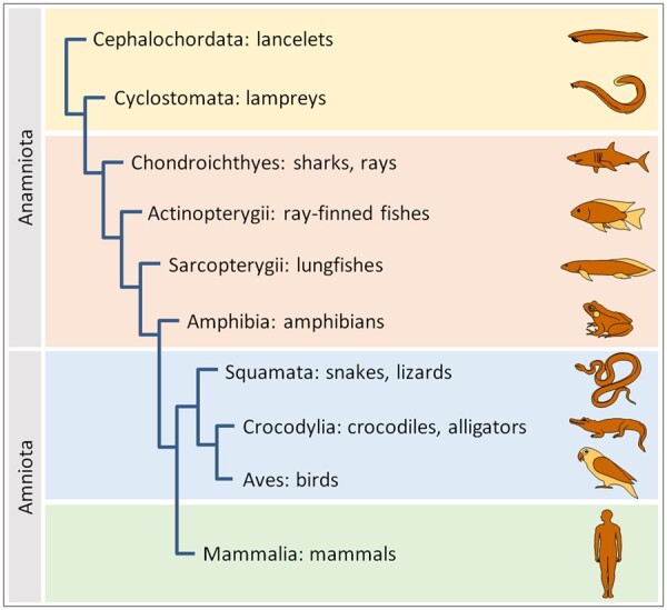 Fig. 6. Overview of the appearance of a pronephros in animal species presented as evolutionary cladogram. For details and references, see Supplementary Table S1. (Cephalochordata and Cyclostomata): pronephros functioning as adult kidney. (Chondroichthyes, Actinopterygii, Sarcopterygii, and Amphibia): pronephros functioning in the larval stage. However, the pronephros seems to be absent in those Elasmobranchii that have no larval stage, and in the Amniota which develop within the body of the parent (Fraser 1950). (Squamata, Crocodylia, and Aves): Although a pronephros has been described in embryos of some of these animals (Supplementary Table S1), the term pronephros should be used with much restraint (Fraser 1950). Further research in these species is needed to clarify the contradictions that appeared in the literature as a result of the use of different definitions. (Mammals): no pronephros is present. |