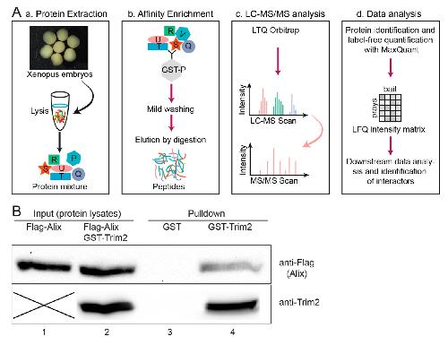 Figure 5. (A) Schematic representation of LC-MS/MS analysis for identification of interaction partners, modified after [31]. (a) Protein lysates were extracted from NF stage 30-36 embryos using mild non-denaturing conditions, (b) GST tagged bait protein and protein interactors from the embryo lysates were enriched by GSH-Sepharose. Subsequently, bound proteins were digested into peptides. (c) The peptide mixture was analyzed by single-shot liquid chromatography tandem mass spectrometry (LC-MS/MS) on an Orbitrap instrument (see acknowledgement). (d) Raw data were processed with MaxQuant to identify and quantify proteins and to identify interacting proteins. (B) Interaction of Trim2 and Alix was verified by GST pulldown assay using GST-Trim2 as bait and lysates of HEK293T cells transfected with Flag-Alix by Western blot. Cell lysates with input proteins (Lanes 1 and 2). GST alone serves as a control (Lane 3). Eluted flag-tagged Alix after binding GST-Trim2 (Lane 4, upper blot). Note: images of the blots are cropped accordingly to the area of exposed protein bands. Uncropped blots in Figure S4. Two different gels/bolts were used to show the eluted flag-tagged Alix and precipitated GST-Trim2 of the same sample. |