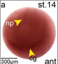 Figure 1. Expression of trim2 during neurogenesis. (aâi) trim2 expression was assessed by whole-mount in situ hybridization (Wmish) at different developmental stages. (a,b) Maternal trim2 transcripts were detected in the animal (an) opposed to the vegetal (vg) hemisphere of Xenopus embryos. (c) NF stage 17, anterior view, trim2 transcripts were evident in the eye field (ef) and in the forming neural tube (nt). (dâf) NF stage 21, lateral, anterior and dorsal views. trim2 transcripts were detected in eye vesicle (ev), neural tube (nt), olfactory (ol), and otic placode (op), as well as cement gland anlage (cg). (gâi) At NF stage 25, trim2 expression became more distinct in eye vesicle (eb), forebrain (fb), midbrain (mb), olfactory placode (ol), otic placode (op), and neural tube (nt). (jâl) NF stage 33, trim2 in fore- (fb), mid- (mb), and hindbrain (hb), eye (ey), olfactory pit (olp), otic vesicle (ov), spinal cord (sc), and trigeminal ganglion (tg). Scales as indicated. (strd-mo n = 20 embryos; trim2-mo n = 16 embryos (E); p = 1.97E-09, unpaired Ï2 test, Ï2 = 36, df =1, phenotype occurrence (po) =16, p < 0.001). |
