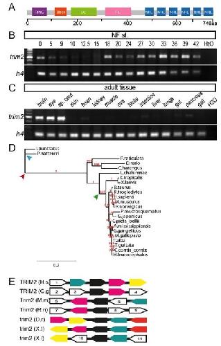 Figure S1. (A) Xenopus Trim2 protein consists of 748 amino acids and is organized in domains containing a single RING zinc finger, two B-box zinc fingers, a single coiled-coiled, Filamin/ABP 280 domain, and six NHL repeats. (B) Semi-quantitative RT-PCR analysis on consecutive developmental stages. Maternal expression of trim2 is observed followed by gradual decrease in expression by gastrulation (NF stage 10) and increasing again. Strong expression at neurulation (NF stage 18) until the latest stages analyzed (NF stage 42) in a gradually increasing manner. Expression of histone H4 was monitored to control total RNA input. (C) Semi-quantitative RT-PCR analysis of trim2 expression in adult tissues. The brain, eye, and spinal cord showed strong expression, while the skin, heart, kidney, muscle, testis, intestine, and pancreas showed weak expression of trim2. (D) Phylogenetic analysis: An evolutionary rooted tree is constructed based on maximum likelihood and bootstrap analysis. The branch length is proportional to the number of substitutions per site. The numbers in red next to nodes represent bootstrap support values. The red arrow indicates the root of the tree, the blue arrow indicates the out-group, and the green arrow indicates the common ancestral node between mammals and amphibians. The bar at the bottom of the phylogram indicates the evolutionary distance to which the branch lengths are scaled based on the estimated divergence. There is a relatively very little divergence observed over time. (E) Synteny organization of Trim2/trim2: The chromosomal localization of the gene encoding trim2 is conserved in mammals. In vertebrates, the locus appeared grossly conserved. Each arrow stands for a single gene. The arrowhead indicates the direction of the ORF. Orthologues are marked with identical colors. trim2 (black arrow) is present in all species analyzed. Upstream trim2 is flanked by the same gene with minor exceptions. Downstream trim2 is flanked by the same gene, except for mammalian. Arrow colors; black: trim2, red: meiotic nuclear divisions 1/mnd1, yellow: transmembrane 131 like/tmem131l, turquoise: FH2 domain containing 1/fhdc1, orange: ADP ribosylation factor interacting protein 1/arfip1, white 1-10: yet uncharacterized proteins. NOT shown: multispecies alignment- due to poor resolution - see Cells article /website for alignment. (F) Comparison of amino acid sequences of TRIM2/Trim2. H. sapiens (GenBank Accession no. NP_001123539), B. taurus (GenBank Accession no. NP_001077204), M. musculus (GenBank Accession no. NP_109631), R. norvegicus (GenBank Accession no. NP_001102022), G. gallus (GenBank Accession no. NP_001244243), D. rerio (GenBank Accession no. NP_001014393), X. tropicalis (GenBank Accession no. NP_001005680), X. laevis (GenBank Accession no. NP_001085492). Conserved domains are indicated by colored boxes according to A. |