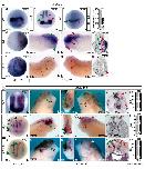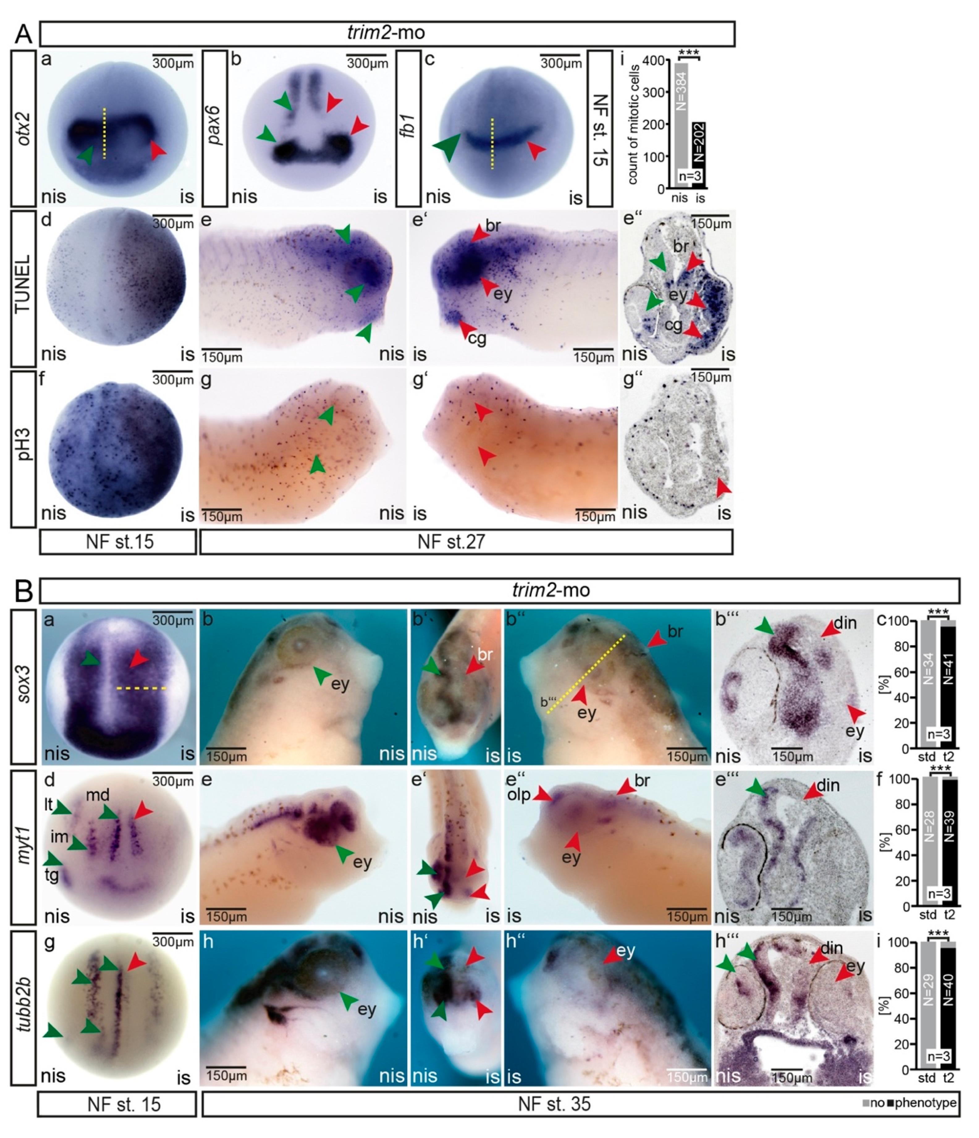 Figure 4. (A) Suppression of trim2 function affected cell proliferation and cell survival within the forming CNS of tadpoles. (a-c; otx2: strd-mo n = 10E; trim2-mo n = 12E; p = 1.85E-05, unpaired Ï2 test, Ï2 =18.33, degrees of freedom (df) =1, po = 11, p < 0.001; fb1: strd-mo n = 10E; trim2-mo n = 12E; p = 2.73E-06, Ï2 =22, df =1, po = 12). At NF stage 15, early forebrain marker gene expression (otx2, pax6, and fb1) appeared apparently expanded (red arrow heads). However, this is accompanied by an increase in apoptotic cells (d, TUNEL), while proliferation (f, pH3) was not affected at this early stage. In young tadpoles (NF stage 27), the rate of apoptosis was highly increased in the brain region including the forming eye (eâ,eââ) and the number of mitotic cells was strongly reduced (gâgââ) (strd-mo n = 12E; trim2-mo n = 20E; p = 2.1E-06, unpaired Ï2 test, Ï2 =22.5, df =1, po = 18, p < 0.001). A similar effect was observed for fb1 and otx2 genes (Figure 4(Aa,Ac); (i) Bar plot: cranial region counted for pH3 positive cells (n = 3 embryos at NF st. 27; nis mean n = 384 cells/embryo, is mean n = 202 cell/embryo, p = 0.0074, paired t-test, percentage error 5%, p > 0.001). (B) Suppression of trim2 function interfered with secondary neurogenesis. (a,d,g) At NF stage 15, sox3 expression appeared expanded, while the specification and differentiation of neuronal fates appeared reduced as monitored by myt1 and tubb2b (red arrow, yellow dashed line strd-mo n = 30E; trim2-mo n = 28E; p = 1.88E-13, unpaired Ï2 test, Ï2 = 54, df =1, po = 27, p < 0.001; myt1: strd-mo n = 30E; trim2-mo n = 28E; p = 1.88E-13, Ï2 = 54, df =1, po = 27; tubb2b: strd-mo n = 30E; trim2-mo n = 29E; p = 7.17E-13, unpaired Ï2 test, Ï2 =51, df =1, po = 27, p < 0.001). (b,c) At NF stage 35, trim2-morphants showed reduced sox3 expression in the dorsal intermediate neurons (din) and the lens epithelium (le). (eâi) Similarly, myt1 and tubb2b expression was almost absent in the morphant brain territory (br), particularly in dorsal intermediate neurons (din), eye (ey), olfactory pit (olp). Red arrowheads indicate the affected regions. Green arrowheads represent the corresponding region on the control side; (b) sox3: strd-mo n = 34E; trim2-mo n = 41 embryos; p = 2.24E-16, unpaired Ï2 test, Ï2 = 67, df =1, po = 39, p < 0.001); (e) myt1: strd-mo n = 28E; trim2-mo n = 39E; p = 2.03E-15, Ï2 = 63, df = 1, po = 38; (h) tubb2b: strd-mo n = 29E; trim2-mo n = 40E; p = 4.85E-15, unpaired Ï2 test, Ï2 = 61, df =1, po = 38, p < 0.001. Scales as indicated. (aâââ,câââ,eâââ) Twenty-micrometer gelatine/albumin transverse sections. |