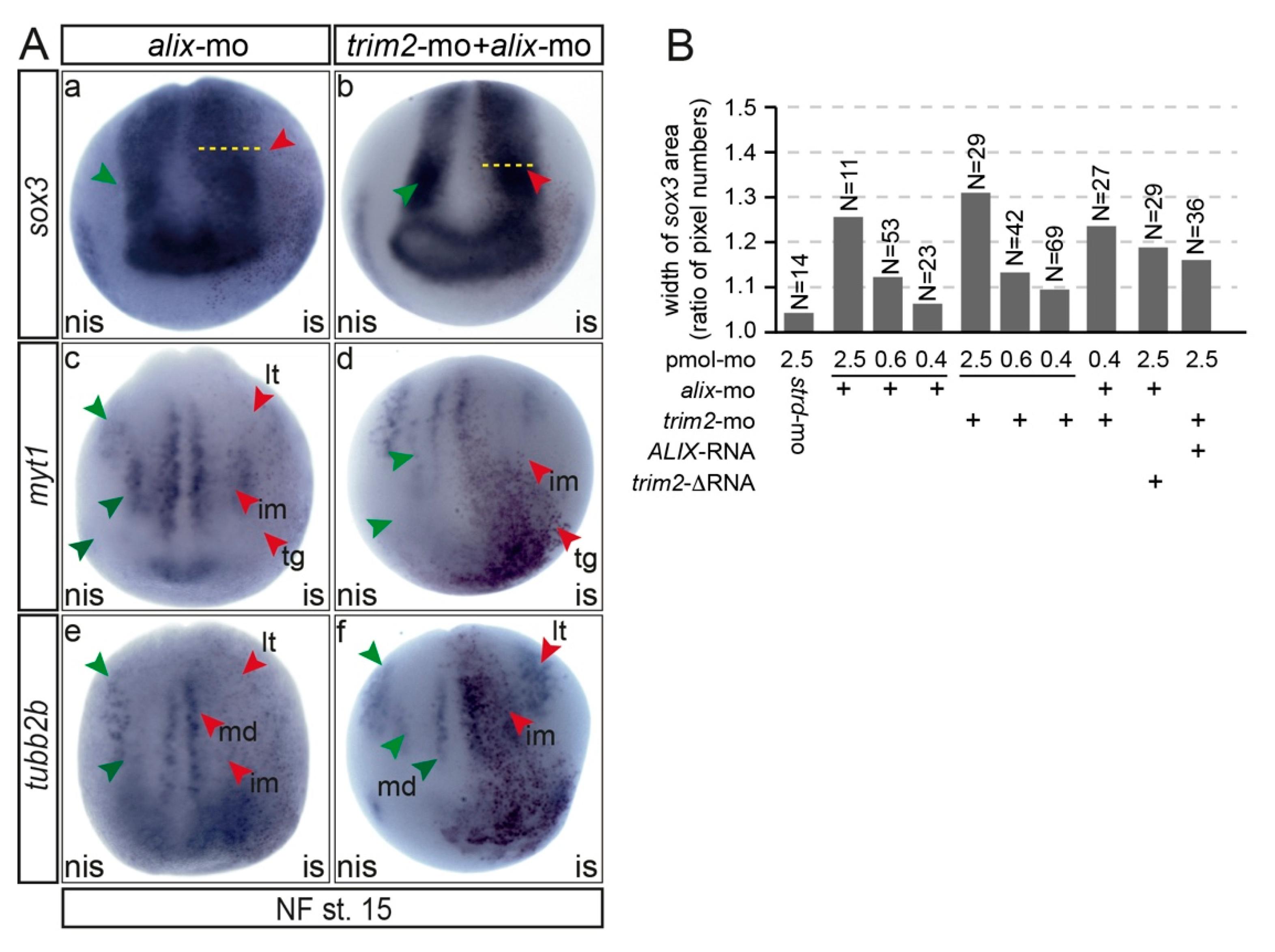 Figure 7. trim2 and alix act in parallel on the formation of primary neurons in Xenopus. (A) A comparison of early neuronal marker gene (sox3, myt1, and tubb2b) expression at NF stage 15 of trim2, alix, and combined morphants revealed that primary neurogenesis is likewise impaired. (aâc) An apparent, widened expression of sox3-positive neural progenitors in the neural plate region on the injected side (red arrowheads and dotted lines). (dâi) The expression of the neural specification marker myt1 and the differentiation marker tubb2b were repressed or lost upon the suppression of trim2, alix, and trim2/alix function. Primary neurons revealed as medial (md), intermediate (im), longitudinal (lt) stripes, and trigeminal placode (tg) (myt1 and tubb2b positive cells). Figure 7a,b: strd-mo, n = 10E; co-inj. trim2/alix-mo, n = 20E; p = 9.47E-06, unpaired Ï2 test, Ï2 =19.6, df = 1, po = 17, p < 0.001; Figure 7c,d: myt1: strd-mo n = 10E; trim2/alix-mo n = 12E; p = 1.85E-05, Ï2 =18, df =1, po = 11; Figure 7c,d: tubb2b: strd-mo, n = 10E; trim2/alix-mo, n = 13E; p = 1.12E-05, unpaired Ï2 test, Ï2 =19, df = 1, po = 12, p < 0.001). (B) Effect of combined injection of low doses of trim2 and alix mo. To determine the dose of morpholino injection that caused only a very mild phenotype compared to standard morpholino-injected embryos, decreasing amounts of trim2-mo or alix-mo were injected into one cell of a two-cell stage embryo. The width of the sox3 expression domain was measured using ImageJ, and the ratio between the non-injected and the injected side was calculated. Combined injection of 0.4 pmol of trim2 and alix-mo each led to an additive effect compared to individual injections (0.4 pmol trim2-mo + 0.4 pmol alix-mo). The trim2 morpholino phenotype could not be rescued by co-injection with either halix-RNA (1ng) n = 36E, and the alix-morpholino phenotype could not be rescued by Îtrim-2 RNA (1ng) n = 29E. |