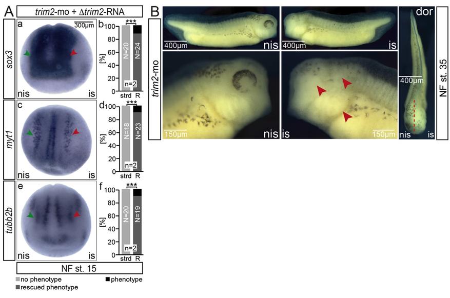Figure S3. (A) Phenotypic rescue of trim2 morpholino-injected embryos. Synthetic Xenopus trim2 RNA (Îtrim-2), which did not contain a complementary sequence of the morpholino, was injected along with trim2 morpholino into one cell of a two-cell stage embryo. (a) The expanded expression of sox3, (c, e) and the medial, intermediate, and longitudinal stripes of myt1 and tubb2b-expressing cells were rescued on the injected side. Red arrows indicate the rescued side. (b, d, f) The percentage of embryos rescued (sox3 strd-mo n = 20 embryos, trim2-mo n = 24 embryos, p = *** 7.21E-09; myt1 strd-mo n = 18 embryos; trim2-mo n = 23 embryos; p = 6.46E-09; tubb2b strd-mo n = 20 embryos; trim2-mo n = 19 embryos; p = 1.78E-08, unpaired Ï2 test). Scale as indicated. (B) Phenotype of trim2 morphants. (A) Upper panel, whole embryo, lateral views, non-injected side (nis) and injected side (is). Bottom panel shows enlarged cranial lateral view. Red arrowhead indicates a suppression of proper head development (eye, otic vesicle, and branchial arches) and pigmentation. The bar plot represents the survival percentage of trim2 morphants compared to non-injected control and standard morpholino-injected embryos. Survival rate was 24% for trim2 morphants. Total injected (ctrl n = 186 embryos, strd-mo n = 288 embryos, trim2-mo n = 254). Survived (ctrl n = 177 embryos, strd-mo n = 253 embryos, trim2-mo n = 62). Scales as indicated. |