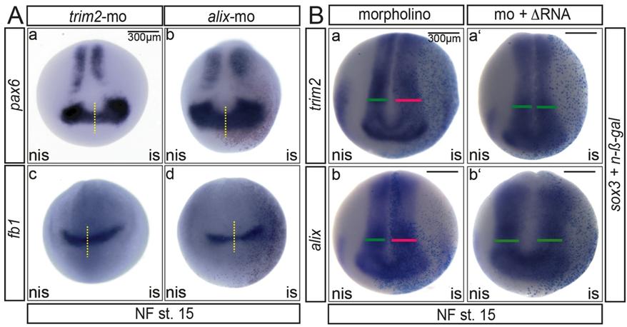 Figure S5. (A) alix and trim2 morphants show an almost identical alteration of marker gene expression. (aâb) Widened expression for pax6 at the prospective forebrain and eye field region on the injected side in both trim2 and alix morphants was observed. (câd) forked head box G1 (fb1) also displayed a relatively expanded band in trim2 and alix morphants. Yellow dotted line indicates the midline. (B) Phenotypic rescue of trim2 or alix morpholino-injected embryos. Synthetic Xenopus trim2 RNA (Îtrim-2) or Human alix RNA, which did not contain a complementary sequence of the morpholino, were injected along with trim2 or alix morpholino respectively into one cell of a two-cell stage embryo. (a, b) The width of the sox3 expression domain on the morpholino-injected sides was expanded but (aâ, bâ) rescued by co-injection of synthetic RNA. The percentage of embryos with no phenotype, phenotype, or rescued phenotype was calculated (trim2-mo n = 42 embryos, trim2-mo plus Îtrim-2 RNA n = 24 embryos, p = 3,46E-04; alix mo n = 52, alix-mo plus halix-RNA n = 14 embryos, p = 2,96E-4). |