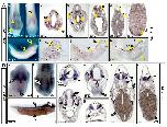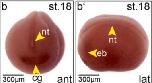 Figure 3. Suppression of trim2 function interferes with embryonic central nervous system (CNS) development. Microinjections of trim2-morpholino were performed into one cell of a two-cell stage embryo. trim2-morphants were analyzed by whole-mount immunochemistry using a commercial Trim2 antibody at (a) NF stage 17 and (b) NF stage 35. (b) Non-injected side (nis), (bâ) anterior view, (bââ) injected side (is). Forming brain (br), cement gland (cg), eye (ey), olfactory pit (olp), and otic vesicle (ov) showed loss of Trim2 expression. (b1âb3) Twenty-micrometer gelatine/albumin transverse sections of the cranial region. The embryonic brain appeared smaller and disorganized upon trim2-morpholino injection. Midbrain (mb), eye (ey), hindbrain (hb), cement gland (cg), otic vesicle, and spinal cord (sc). Red arrowheads represent the affected region of the injected side. Green arrowheads indicate complementary regions of the control side (nis). Scales as indicated. |