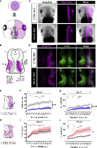 (HâJ) Quantification of the group data for off responses in postCTRL-MO (n = 10, gray) and postGluN1-MO (n = 9, blue) conditions. (H) Percentage of field covered. (I) Sum of all responsive CSCs. (J) Maximum CSC response.