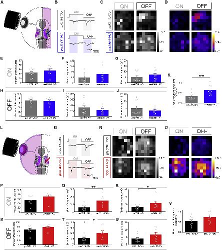 (LâO) (L) Visual stimuli were presented by a fiber optic to the eye of the tadpole on the MO side to record RFs of contralateral tectal neurons in preCTRL-MO or preGluN1-MO conditions. (M) Example traces showing the responses to onset and offset of stimulation. Shaded area was used to measure CSC. Example heatmaps generated as relative response intensities (N) and absolute response intensities (O) with on (first column) and off (second column) responses.