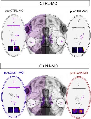 PostGluN1-MO leads to smaller AMPAR-mediated responses, higher mEPSC frequency, and simplified tectal dendritic arbors with more complex RGC arbors, as well as a larger PPR. PreGluN1-MO leads to larger AMPAR-mediated responses, higher amplitude of mEPSCs, and simplified RGC arbors with more complex tectal dendritic arbors, as well as an overall more responsive receptive field. |