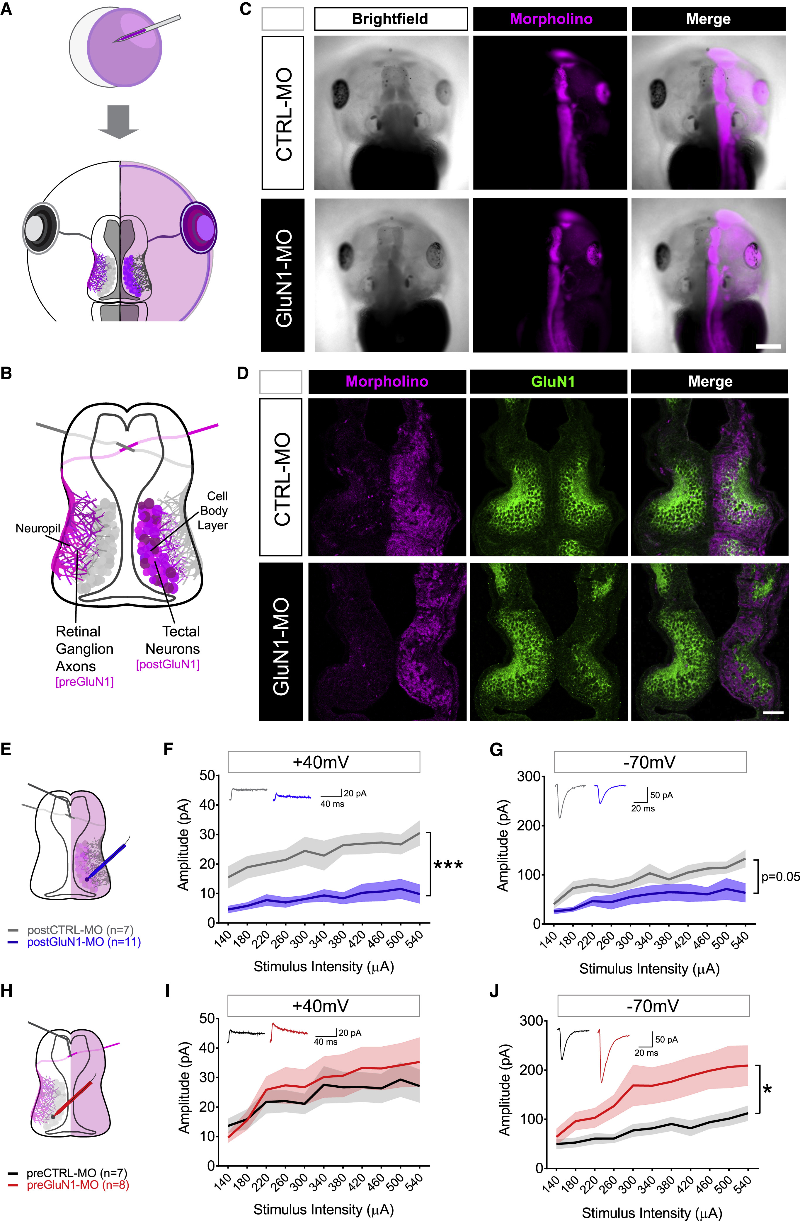 (EâG) Tectal neuron recordings in postGluN1-MO condition (E). Input-output curves of tectal neurons measured at a holding potential of +40 mV to ascertain the NMDAR-mediated current in postCTRL-MO (n = 7, gray) and postGluN1-MO (n = 11, blue) cells (F) and at â70 mV to ascertain the AMPAR-mediated current in postCTRL-MO (n = 7, gray) and postGluN1-MO (n = 11, blue) conditions (G).