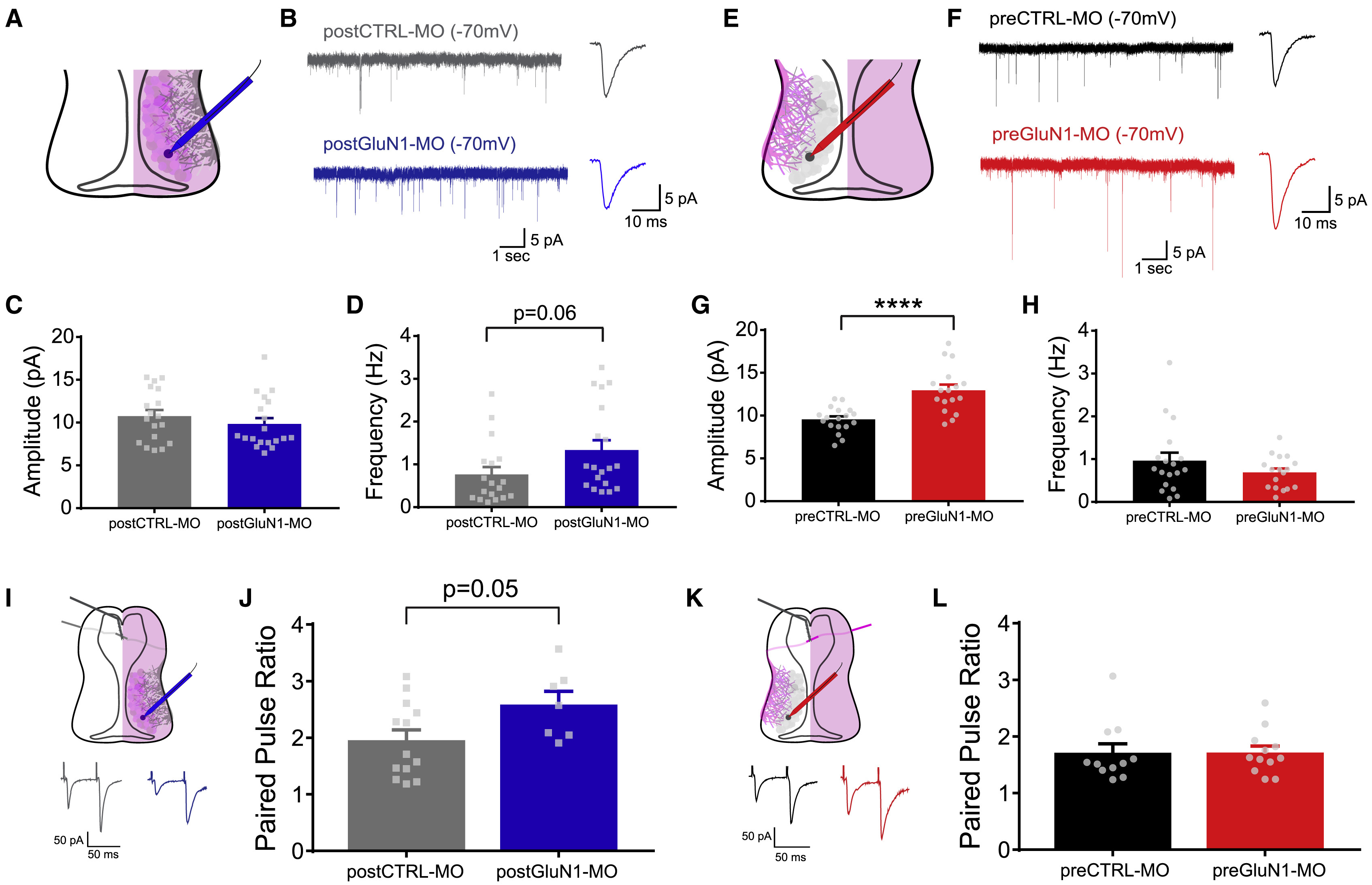 (A–D) (A) Whole-cell patch clamp recording of mEPSCs in postGluN1-MO condition. (B) Example mEPSC traces for postCTRL-MO (gray) and postGluN1-MO (blue) conditions with an example of an averaged individual event. Quantification of mEPSC amplitude (C) and frequency (D) for postCTRL-MO (n = 18, gray) and postGluN1-MO (n = 19, blue).