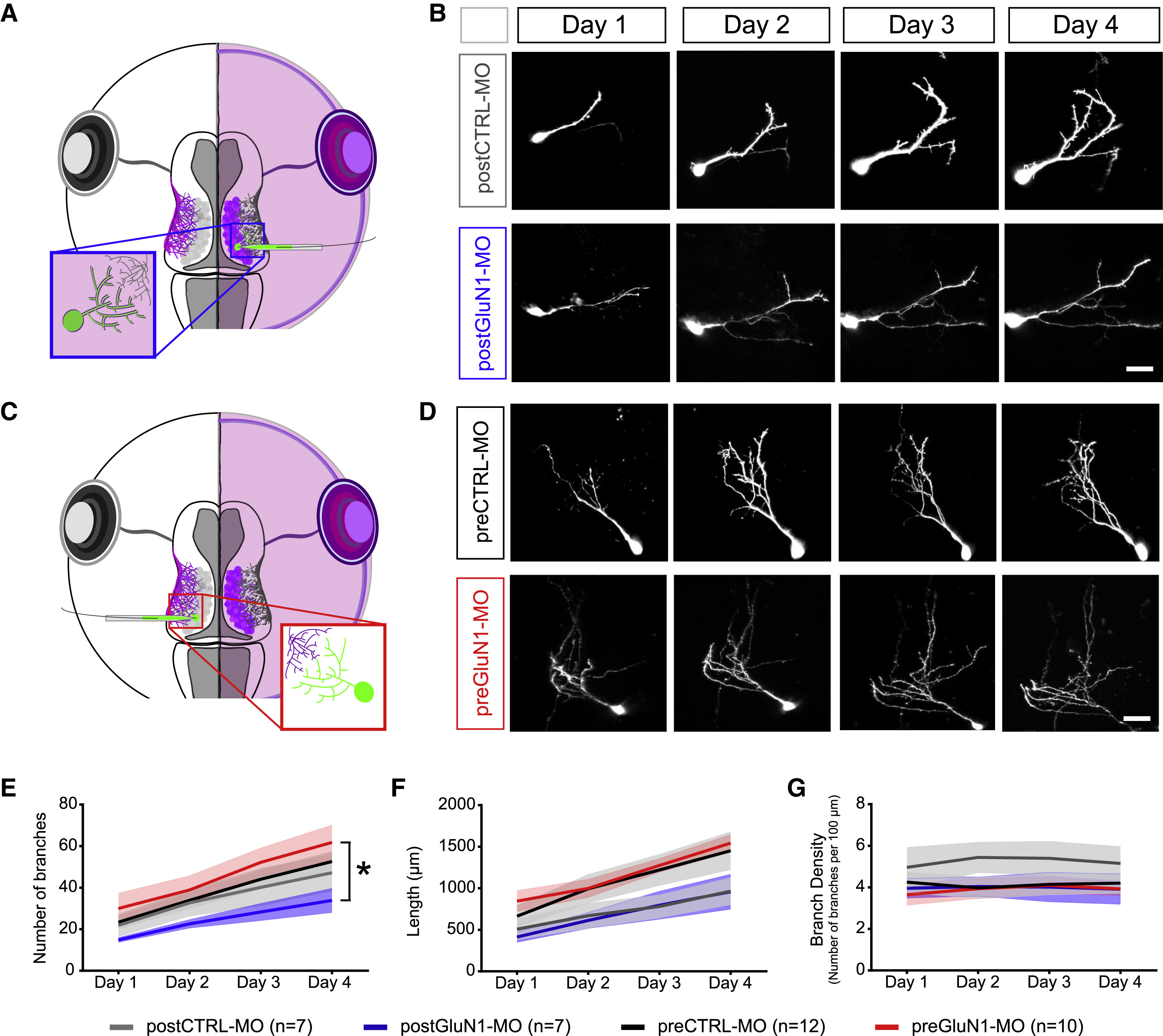 (CâE) Morphometric analysis of axonal branch number (C), total axonal arbor length (D), and branch density (number of branches per 100 μm) (E) over 4 days (postCTRL-MO [n = 11, gray] and postGluN1-MO [n = 8, blue]).
