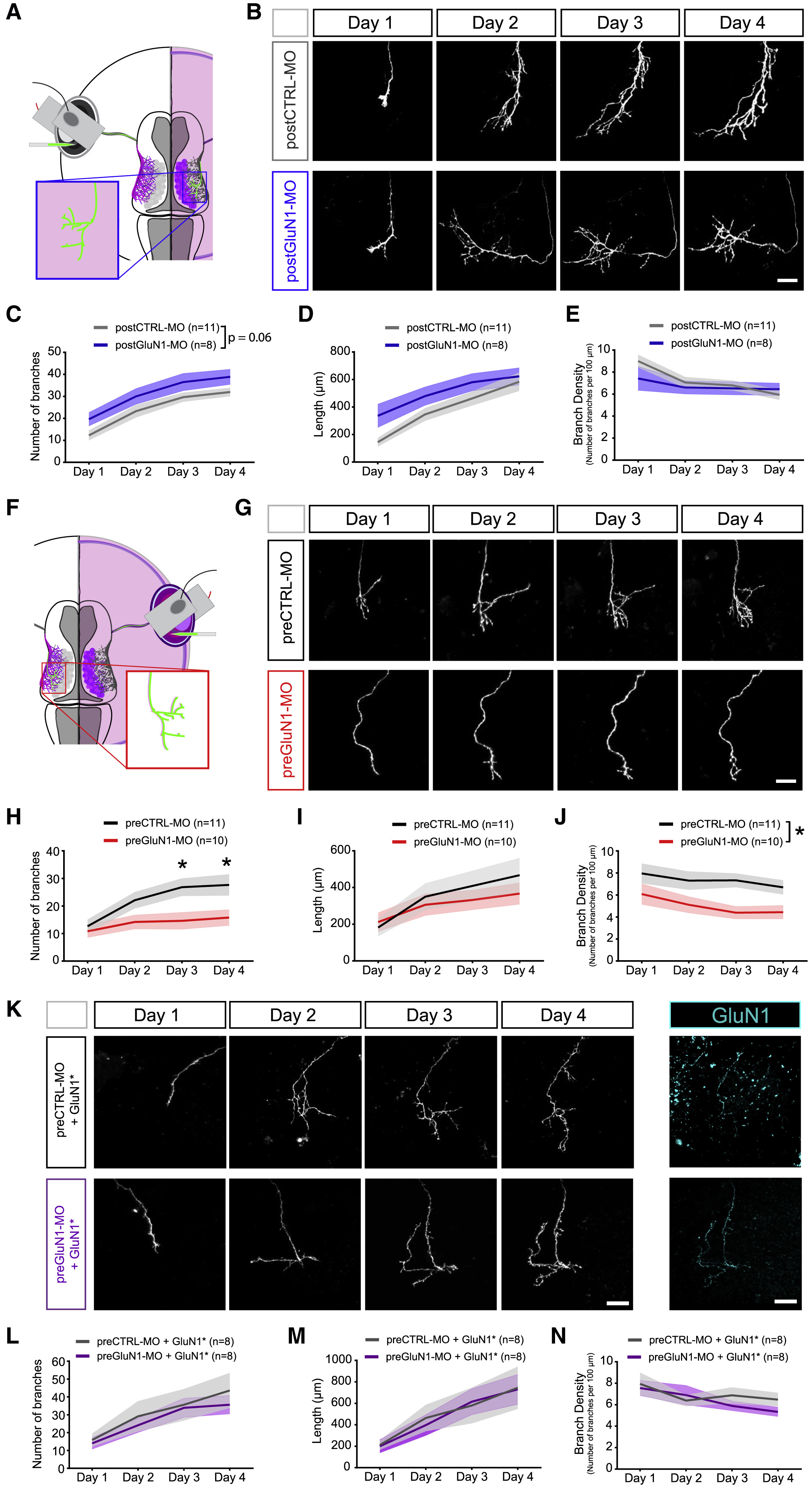 (HâJ) Morphometric analysis of axonal branch number (H), total axonal arbor length (I), and branch density (number of branches per 100 μm) (J) over 4 days (preCTRL-MO [n = 11, black] and preGluN1-MO [n = 10, red]). (H) âp ⤠0.05, two-way repeated-measures ANOVA with Sidak post-test. (J) *p ⤠0.05, two-way repeated-measures ANOVA, main effect.