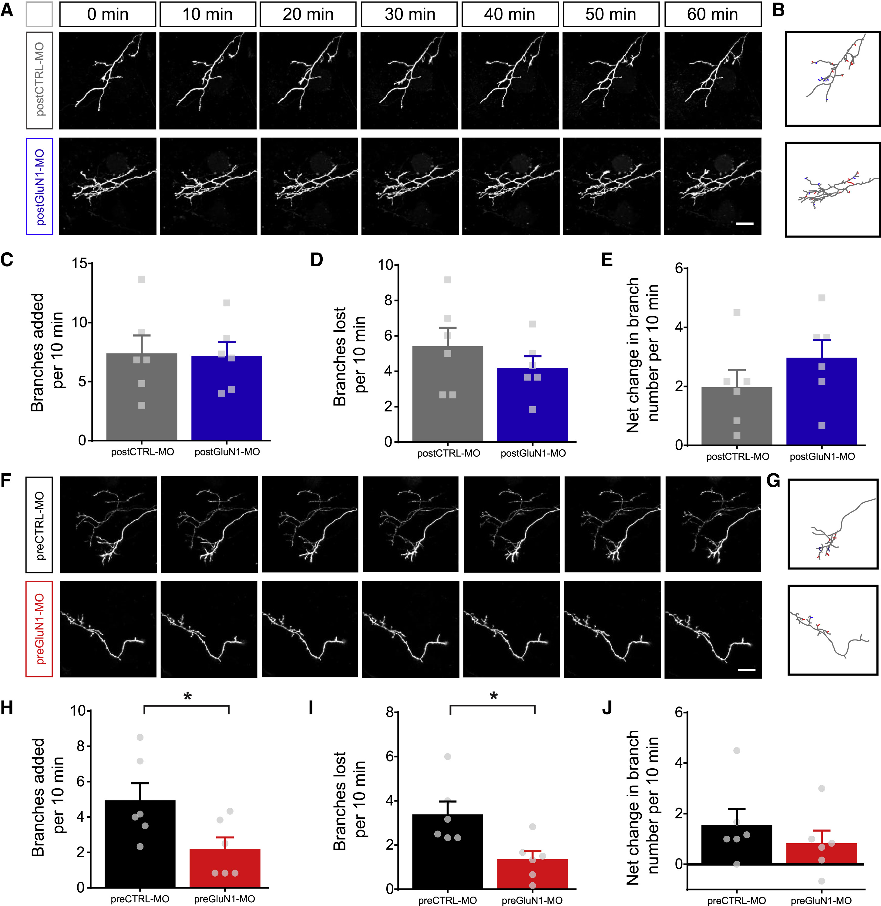(CâE) Morphometric analysis of the number of branches added per time point (C), number of branches lost per time point (D), and net change in branch number (E) per 10-min period of imaging (additions â losses) (postCTRL-MO [n = 6, gray] and postGluN1-MO [n = 6, blue]).