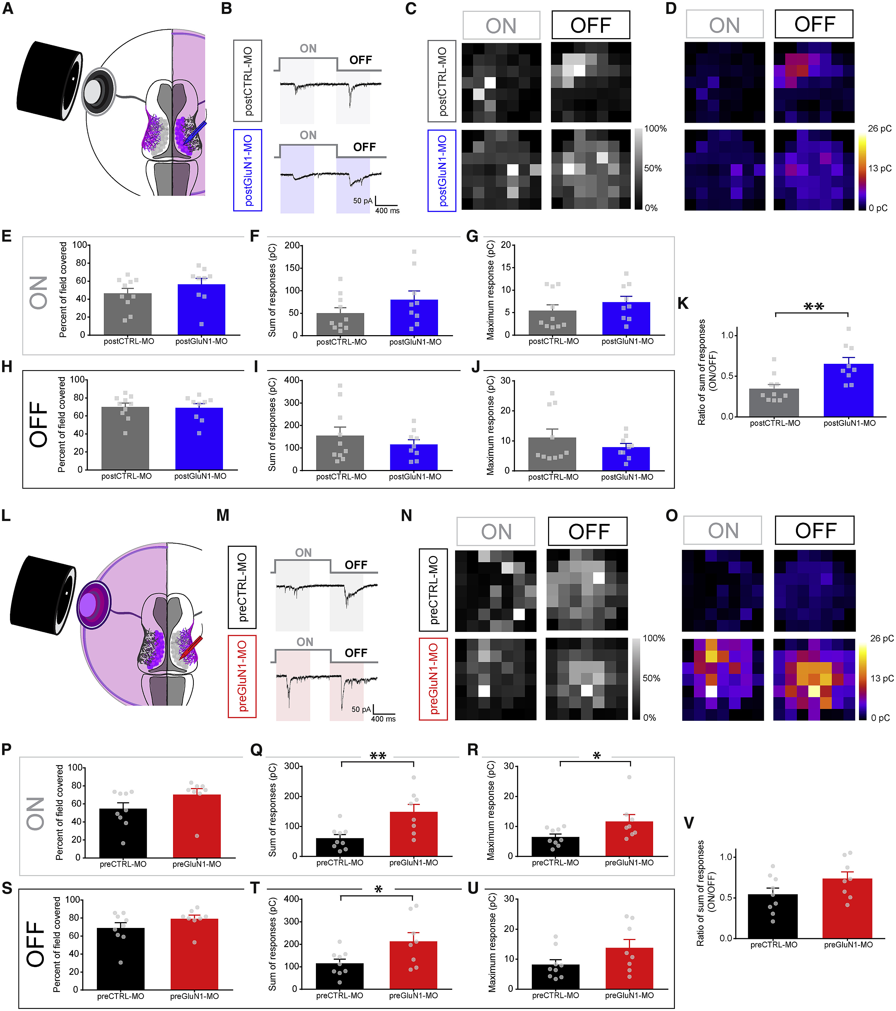 (PâR) Quantification of the group data for the on responses in preCTRL-MO (n = 9, black) and preGluN1-MO (n = 8, red) conditions. (P) Percentage of field covered. (Q) Sum of all responsive CSCs. (R) Maximum CSC response.