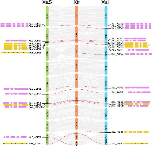 Fig. 1 Synteny analysis between the homeologs in X. laevis and X. tropicalis genome. The linkages between the AQP genes were marked with red lines. Genome location and gene structure of the AQP genes in X. laevis genome were shown beside the chromosomes. The wedges colored in violet and yellow represent the exon regions in AQP genes. Different color represents the different encoding direction. The shrinked lines represent the intron regions |