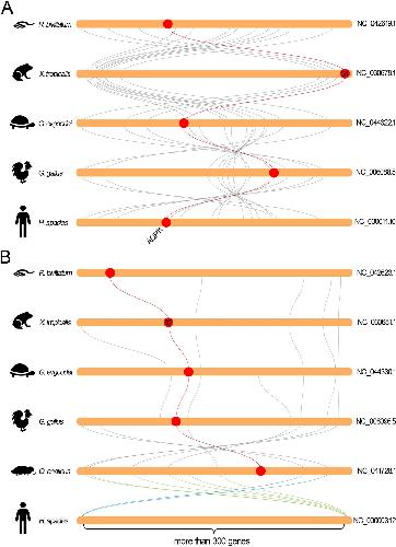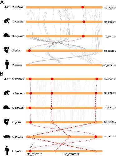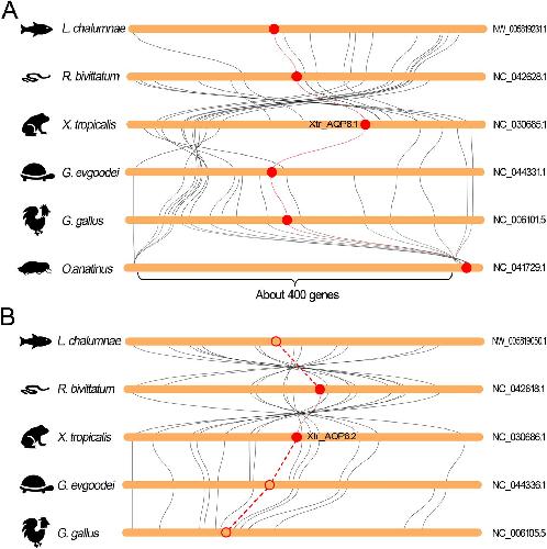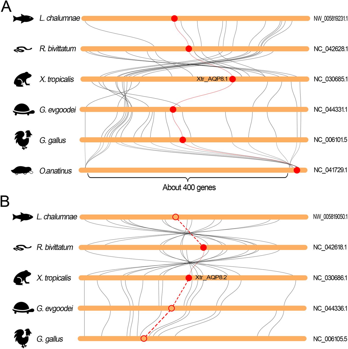 Fig. 7 Collinearity relationship between the orthologs in AQP-8 subfamily in different species. a Collinearity analysis of AQP8.1 orthologs. b Collinearity analysis of AQP8.2 orthologs. The round-corner rectangles filled in yellow represent the conserved regions of the chromosomes in different species. The words behind the round-corner rectangles represent the number of chromosomes. The circles filled in red represent the AQP orthologs appeared in the corresponding chromosome. The hollow circles represent the lost AQP orthologs in the corresponding chromosome. The red curves represent the linkages between the AQP orthologs. The dashed lines represent the imaginary linkages between the lost genes |
