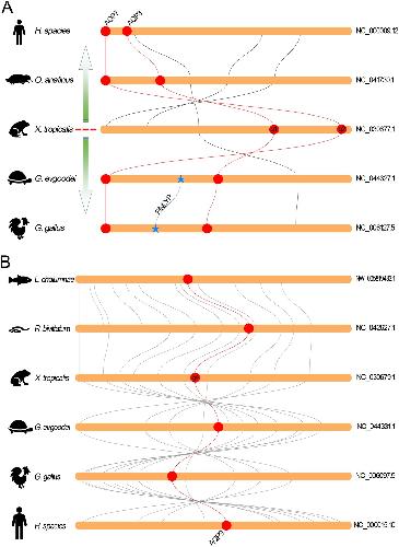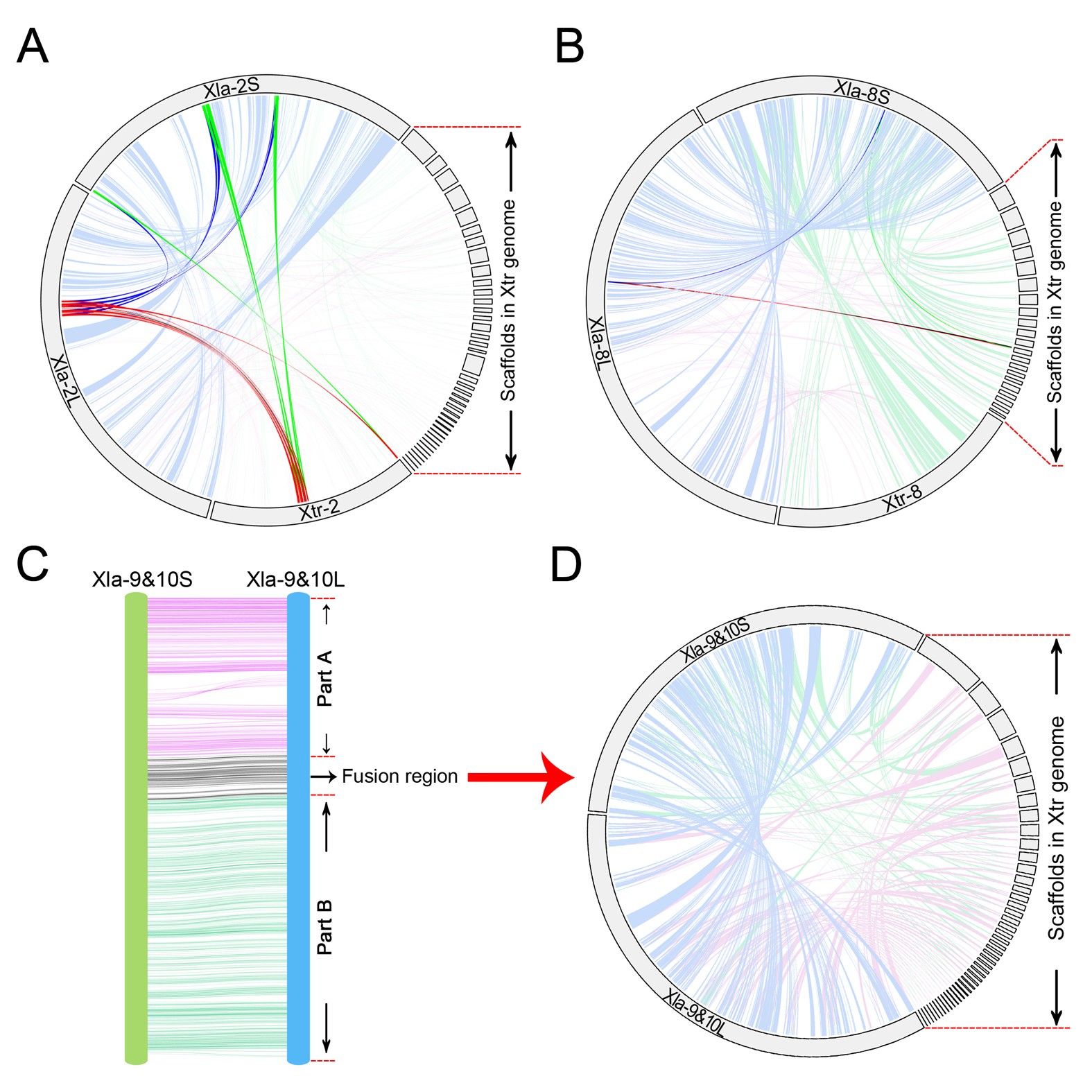 Synteny analyses of the corresponding region in the genome of Xla and Xtr. (A) Collinearity analysis of the region in the end terminal of the second chromosome in Xla and some scaffolds in Xtr. (B) Collinearity analysis of the region in the end terminal of the eighth chromosome in Xla and some scaffolds in Xtr. (C) Collinearity analysis between the ninth pair chromosomes in Xla genome. Part A represent the region corresponding to the tenth chromosome in Xtr genome. Part B represent the region corresponding with the ninth chromosome in Xtr genome. Fusion region represent the genes in this region were not detected in both the ninth and tenth chromosomes in Xtr genome. (D) Collinearity analysis of the fusion region in Xla genome and some scaffolds in Xtr genome. |