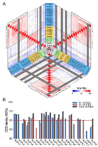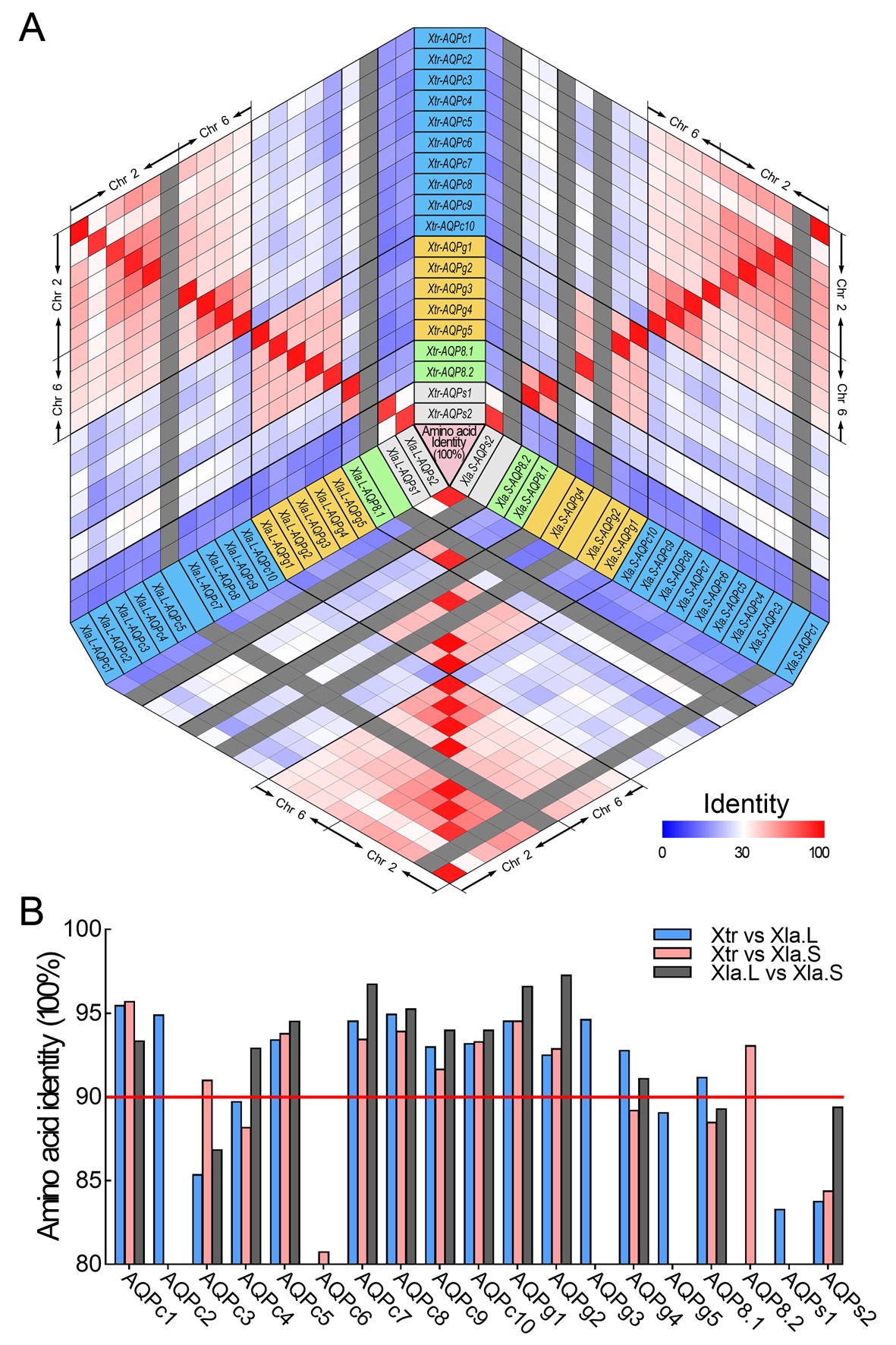 Identities between the CDS encoding AQP genes in the homeologs of X. laevis and X. tropicalis genome. (A) Heatmap of the identities between the sequence of AQP CDS in Xla and Xtr genome. (B) Identity between the ortholog AQP genes in Xla and Xtr genome. |