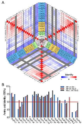 Identities between the amino acid sequences of AQP genes in the homeologs of X. laevis and X. tropicalis genome. (A) Heatmap of the identities between the amino acid sequence of AQP in Xla and Xtr genome. (B) Identity of the amino acid sequences between the ortholog AQPs in Xla and Xtr genome. |