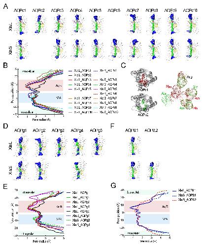 Pore pattern analyses of the AQPs in X. laevis genome. (A) Inner surface of the AQP proteins that clustered into C-AQP subfamily in Xla genome. (B) Individual diameter profiles of the AQP protein channel that clustered into C-AQP subfamily. (C) Comparison of the structure of the Ar/R region between AQPc1 and AQPc2. (D) Inner surface of the AQP proteins that clustered into AQGP subfamily in Xla genome. (E) Individual diameter profiles of the AQP protein channel that clustered into AQGP subfamily. (F) Inner surface of the AQP proteins that clustered into AQP-8 subfamily in Xla genome. (G) Individual diameter profiles of the AQP protein channel that clustered into AQP-8 subfamily. |