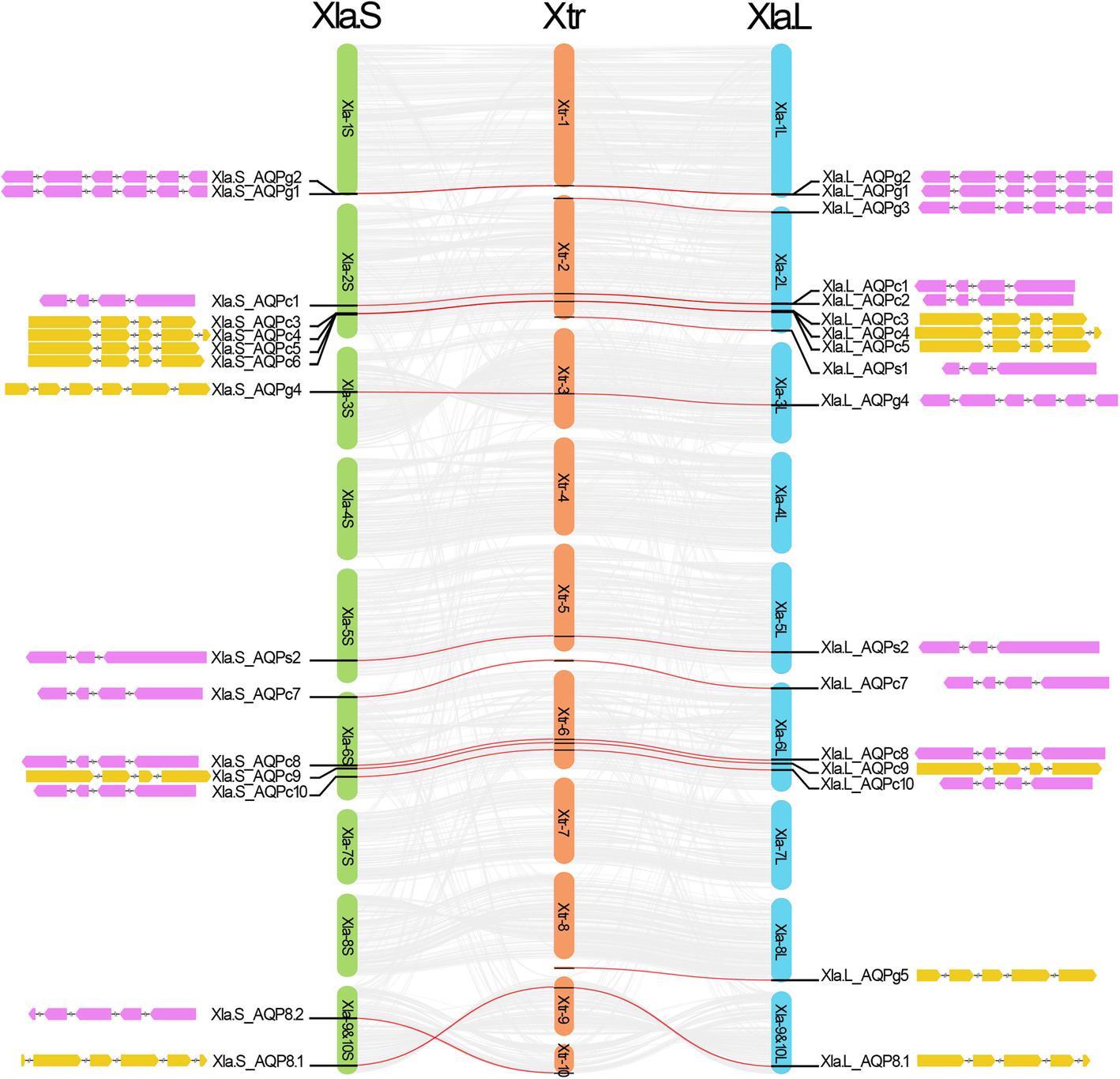 ig. 3 Deletion of AQP genes in the second pair chromosomes in X. laevis. a Synteny analysis of the second chromosomes in the homeologs in X. laevis and X. tropicalis genome. The regions encoding AQP genes were shadowed in light yellow. The linkages between AQP genes were marked with red line. AQP gene names in Xla genome were marked beside the second chromosomes. b Synteny analysis of region-2A encoding AQPg3 ortholog. c Synteny analysis of region-2B encoding AQPc1 and AQPc2 orthologs. d Synteny analysis of region-2C encoding AQPc3 to AQPc6 orthologs. e Synteny analysis of region-2D encoding AQPs1 ortholog. In this figure, red curves represent the linked genes were appeared in both Xtr and the corresponding homeologs in Xla. Red dashed lines represent the genes that appeared in Xtr genome but absented in Xla genome |
