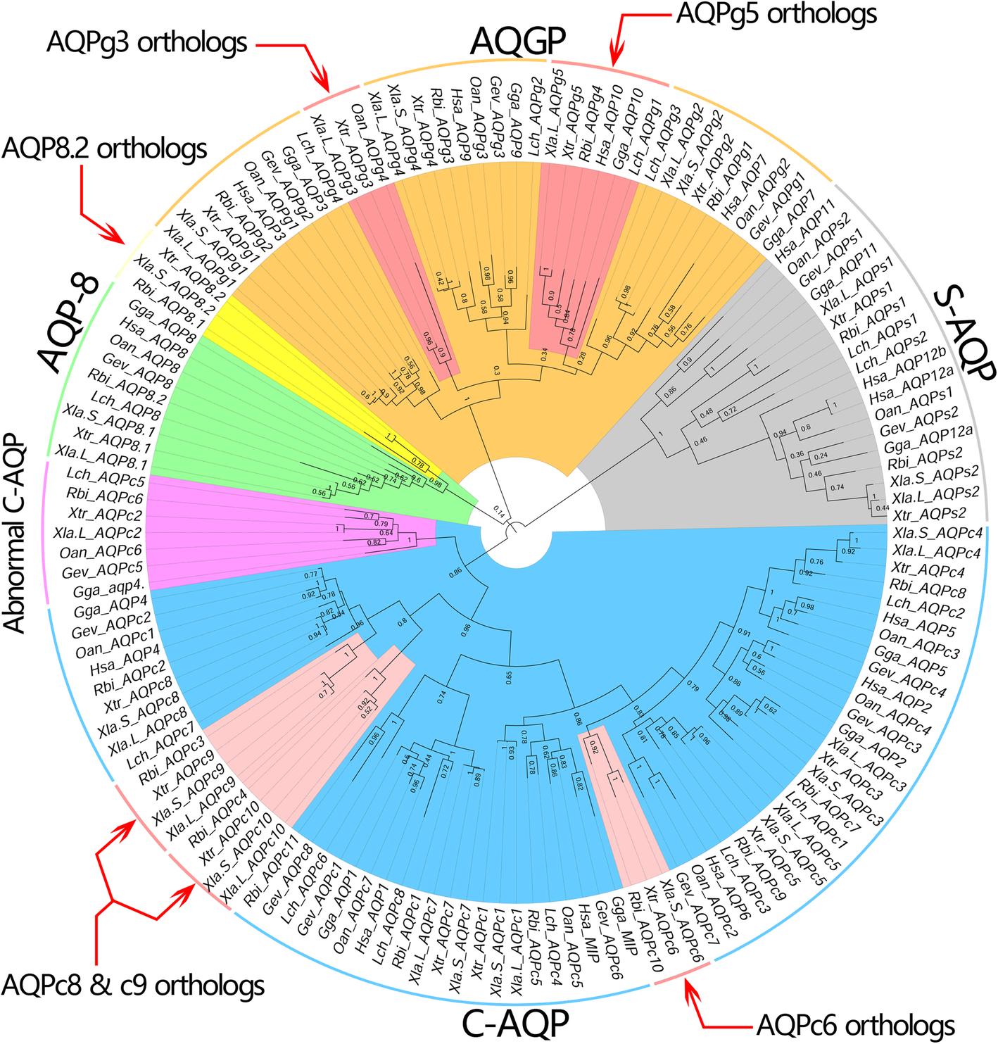 Fig 2. Maximum likelihood based phylogenetic tree of the AQP families in vertebrates. The AQP families were distinct separated into four clades (marked with different colors), representing the four subfamilies respectively. The protein sequences were collected from the following species: Latimeria chalumnae (Lch), Rhinatrema bivittatum (Rbi), Xenopus laevis (Xla), Xenopus tropicalis (Xtr), Gopherus evgoodei (Gev), Gallus gallus (Gga), Ornithorhynchus anatinus (Oan), Homo sapiens (Hsa) |