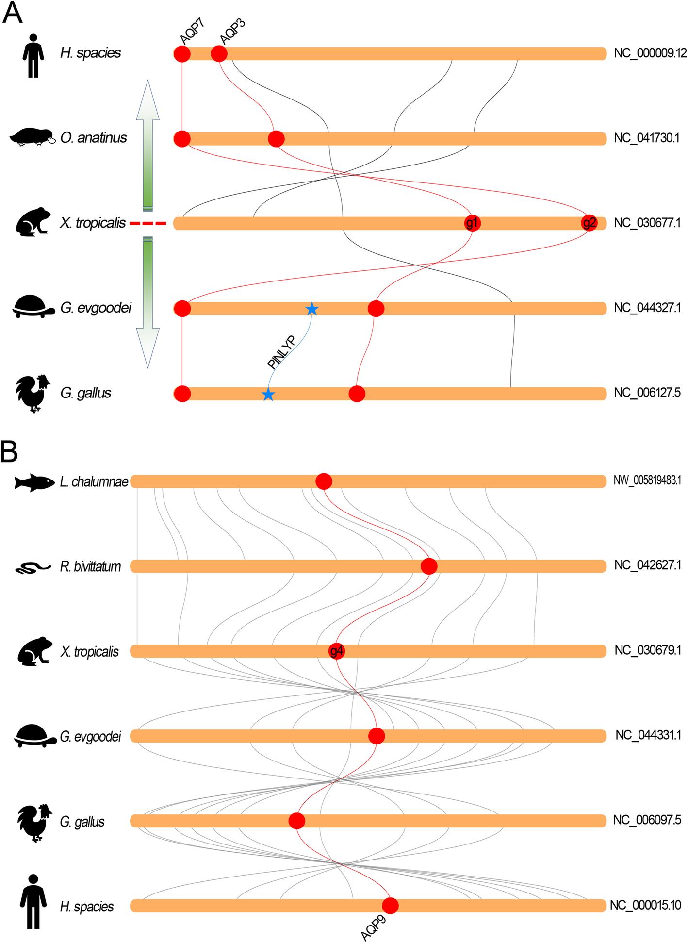 Fig. 8 Collinearity relationship between the orthologs in AQGP subfamily in different species. a Collinearity analysis of AQPg1 and -g2 orthologs. b Collinearity analysis of AQPg4 orthologs. The round-corner rectangles filled in yellow represent the conserved regions of the chromosomes in different species. The words behind the round-corner rectangles represent the number of chromosomes. The circles filled in red represent the AQP orthologs appeared in the corresponding chromosome. The red curves represent the linkages between the AQP orthologs. The blue stars represent the inserted gene between the orthologs of AQPg1 and -g2. The blue curve represents the linkage between the inserted gene