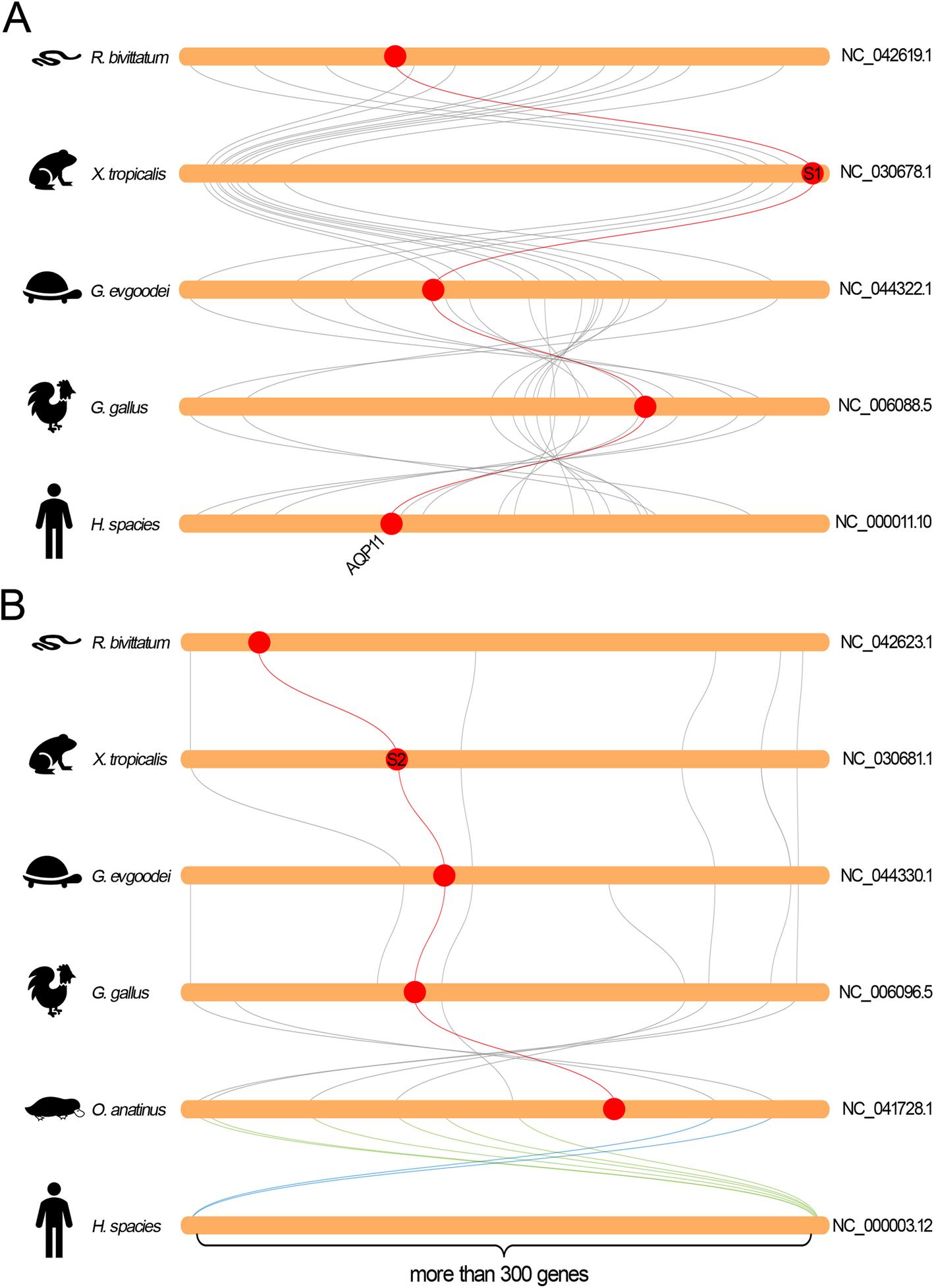 Fig. 9 Collinearity relationship between the orthologs in S-AQP subfamily in different species. a Collinearity analysis of AQPs1 orthologs. b Collinearity analysis of AQPs2 orthologs. The round-corner rectangles filled in yellow represent the conserved regions of the chromosomes in different species. The words behind the round-corner rectangles represent the number of chromosomes. The circles filled in red represent the AQP orthologs appeared in the corresponding chromosome. The red curves represent the linkages between the AQP orthologs |
