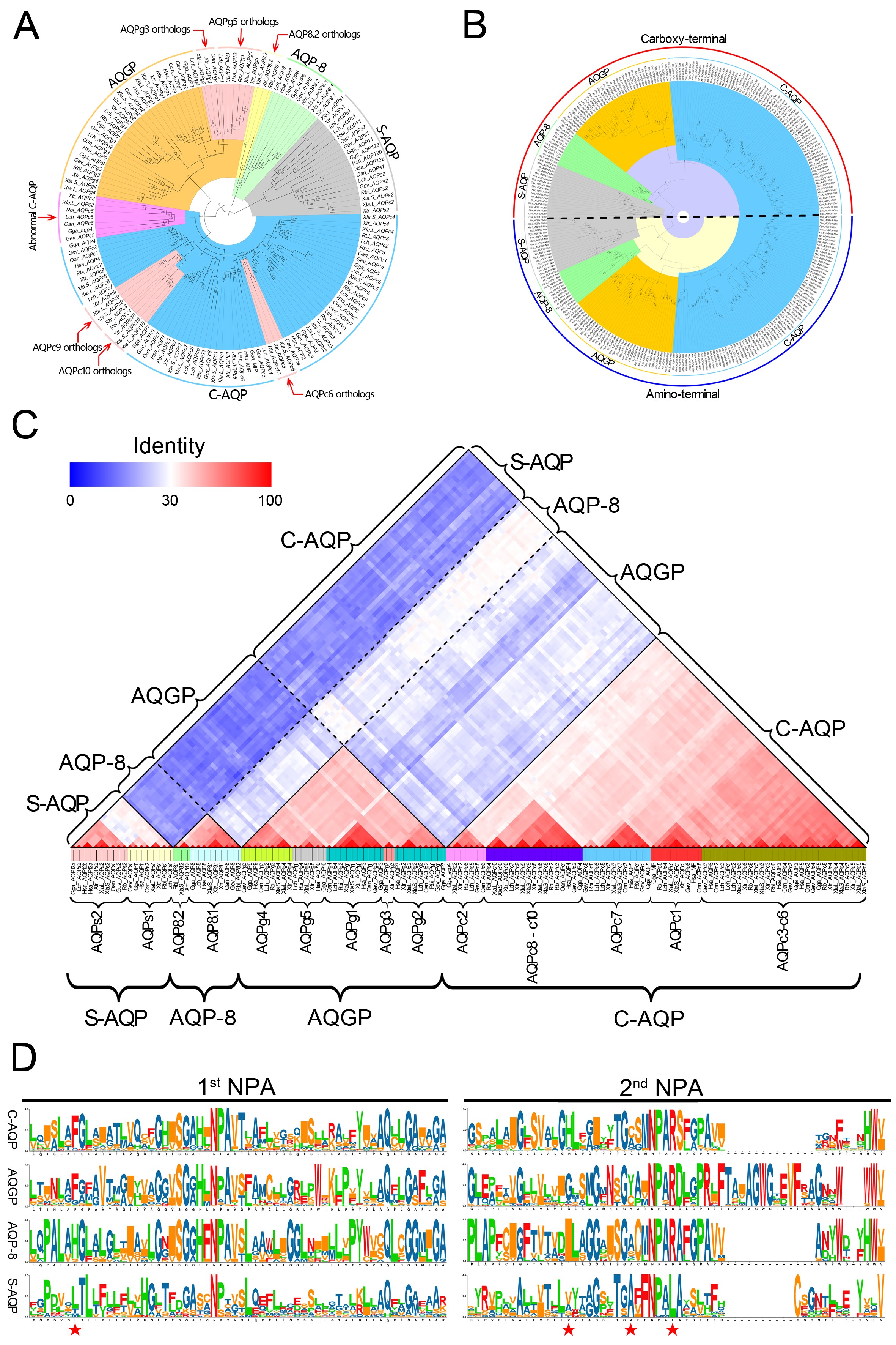 Phylogenetic analysis of the AQP genes in vertebrates. (A) Neighbor-Joining based phylogenetic tree of the AQP genes in different vertebrates. (B) Maximum likelihood based phylogenetic tree of the amino terminal and carboxy terminal of the AQP protein sequences in different vertebrates. The AQP families were distinct separated into four clades (marked with different colors), representing the four subfamilies respectively. (C) Identities between the amino acid sequences of AQP genes in different vertebrates. (D) The conserved amino acids in the two NPA motifs. The protein sequences were collected from the following species: Latimeria chalumnae (Lch), Rhinatrema bivittatum (Rbi), Xenopus laevis (Xla), Xenopus tropicalis (Xtr), Gopherus evgoodei (Gev), Gallus gallus (Gga), Ornithorhynchus anatinus (Oan), Homo sapiens (Hsa). |