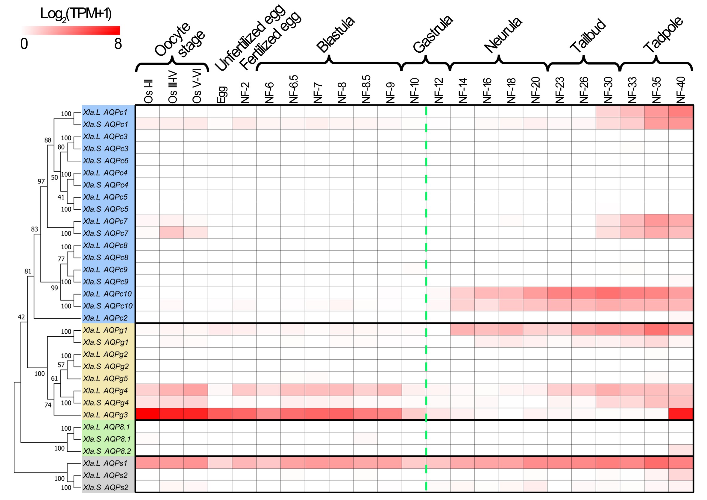 Additional file 10: Figure S10. Heatmap of the AQP family expression pattern throughout the embryo development stages of X. laevis.