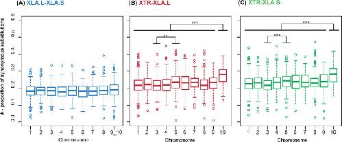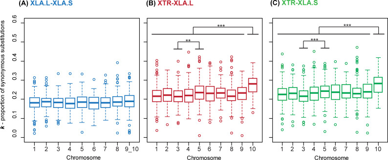 Fig 1. Boxplots depicting proportion of synonymous substitutions (k) for each chromosome.Between (A) X. laevis L (XLA.L) and S (XLA.S) sub-genomes, (B) X. tropicalis (XTR) and XLA.L, and (C) XTR and XLA.S. **p < 0.01, ***p < 0.0001 (adjusted p-values from Tukey multiple comparisons of means).
