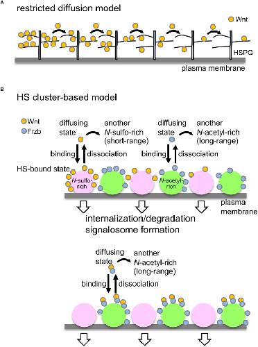 FIGURE 2. Models to control Wnt signaling and dispersal by HSPGs. (A) Restricted diffusion model. Based on genetic studies in Drosophila, it has been proposed that HSPGs mediate Wnt delivery by a restricted-diffusion mechanism, in which Wnt ligands are transported in a âbucket brigadeâ manner by repeated association and dissociation with HSPGs on cell membranes (Yan and Lin, 2009). (B) Model to explain Wnt signaling and delivery by clustering of HSPGs. Wnt8 preferentially binds to N-sulfo-rich HS clusters and Frzb binds to N-acetyl-rich clusters (upper; Mii et al., 2017). Accumulation of Wnt8 on N-sulfo-rich HS clusters leads to signalosome formation and internalization of Wnt8, which may contribute to degradation of Wnt8. When Frzb is abundant (lower), Wnt8-Frzb complexes bind to N-acetyl-rich HS clusters, which may reduce degradation of Wnt8 (Mii et al., 2017). Given that these two clusters are not distributed uniformly on the cell surface, it seems unlikely that Wnt ligands are transported in a âbucket brigadeâ manner between these clusters. Since N-sulfo-rich HS clusters are frequently internalized, this cluster appears to shorten the distribution range of Wnt8 (Mii and Taira, 2009). On the other hand, N-acetyl-rich HS clusters tend to remain on the cell surface, resulting in long-range distributions of Frzb as well as Wnt8-Frzb complexes (Mii and Taira, 2009). One possible model is that the balance of Wnt interactions between N-sulfo-rich HS clusters and N-acetyl-rich HS clusters may regulate Wnt signaling range in tissues.
