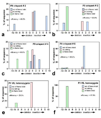 Figure S5. Comparison of the editing efficiency of the mtnr1a T2 sgRNA in F0 mutant animals. Trace decomposition yields the spectrum of indel size and frequency occurring within a 0 to 12- bp indel size range. (a) The F0 crispant #2, which is the male founder of all of the F1 progeny described in this study, does not display a 9-bp deletion in this TIDE analysis of PCR products from gDNA extracted from a pair of web clips. (b-d) F0 sibling crispants #3-5 all display a 9-bp deletion at various frequencies, with crispant #3 having the highest frequency. (e) For comparison, PCR of web clip gDNA from an F1 heterozygous VIL mutant frog displays the expected indels only at 0 and -9-bp. (f) A sibling F1 homozygous VIL mutant frog displays a -9-bp indel only, as anticipated. TIDE analysis was performed using http://tide.nki.nl [81]. |