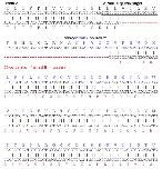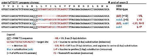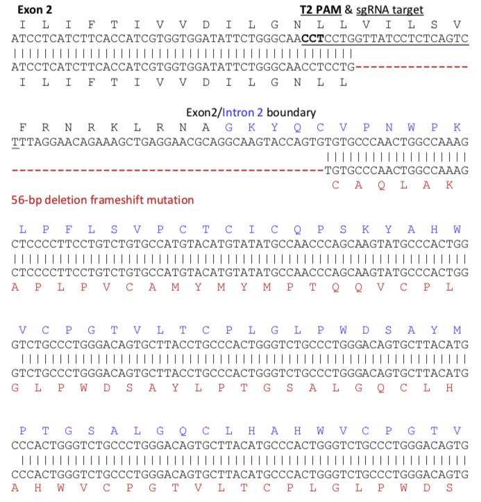 Figure S12. Alignment of WT and F1 X. tropicalis mtnr1a heterozygous 56-bp deletion mutant. The upper sequence is WT with hypothetical amino acids in the non-coding intron corresponding to the codon below indicated in blue. The mutant is the lower sequence, with the hypothetical amino acid sequence centered over the corresponding codon indicated in red. The T2 sgRNA target sequence is underlined with the PAM sequence underlined in bold. The 56-bp deletion occurs at the boundary of exon 2 and intron 2 (Exon 2/Intron 2 boundary), and is indicated by red dashes (---). Since 56 is not a multiple of three, the deletion causes a hypothetical shift in the reading frame. Note that the amino acids indicated in blue or red downstream of the mutation are not expected to be expressed, and are shown only to illustrate the misalignment of nucleotides due to the putative frameshift. Since the exon/intron splice site is skipped in the mutant due to the 56-bp deletion, the non-coding region downstream of the deletion could theoretically encode aberrant protein, indicated in red. No stop codons were observed in the mutant sequence downstream of the deletion. |