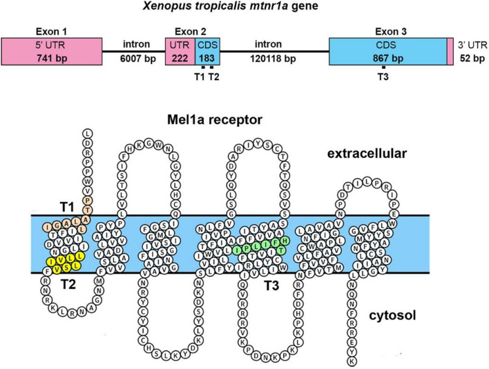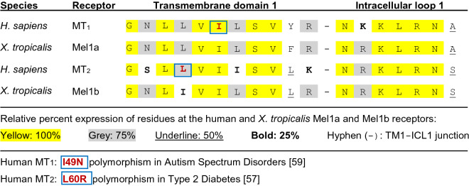 Figure 8. Amino acid alignment of the endofacial portion of the first transmembrane domain of human and X. tropicalis melatonin receptors. The hydrophobic residues of transmembrane domain 1 (TM-1) located near the membrane cytoplasmic surface is highly conserved among GPCRs, as exemplified by the alignment of this region in the human MT1 and MT2 receptors and the homologous X. tropicalis Mel1a and Mel1b receptors. The human MT1 and Xenopus Mel1a receptors show a 100% amino acid identity in the GNLLVILSV 9-bp region in TM-1. The first intracellular loop (ICL-1) is also highly conserved, as indicated in yellow. The mtnr1a T2 sgRNA most effectively targeted the hydrophobic LLVIL residues (see Supplementary Fig. S6) in the center of the Xenopus Mel1a endofacial TM-1 region illustrated here. This region is the site of a human MT1 nonsynonymous point mutation (I49N) associated with autism59 and a human MT2 mutation (L60R) linked to type 2 diabetes57. The amino acid point mutations associated with each disorder are indicated by a blue box. |