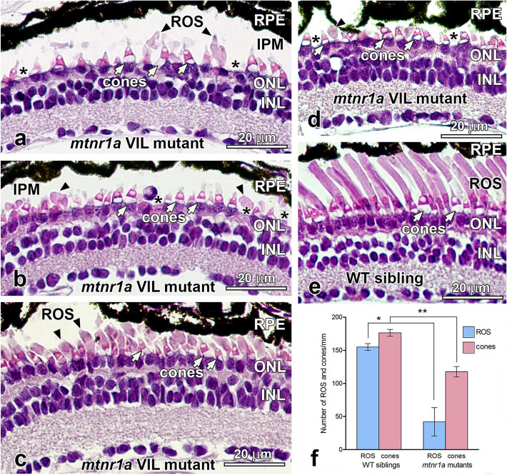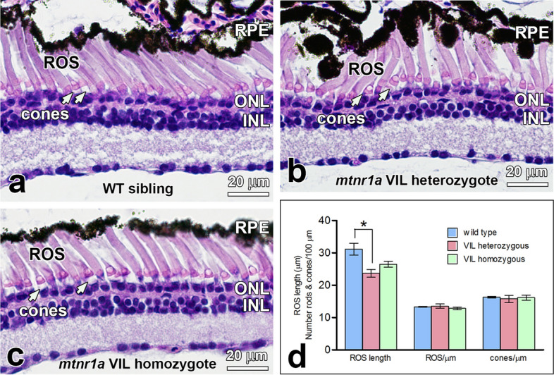 Figure 5. Rods are dystrophic in stage 54â56 (4-month-old) F2 heterozygous but not homozygous mtnr1a VIL mutant tadpoles (nâ=â5). F2 heterozygous and homozygous tadpoles were generated by crossing two F1 VIL mutant heterozygotes. (a) WT siblings of F2 mutants exhibit healthy-appearing rod and cone photoreceptors. (b) Central retinas of VIL mutant heterozygous tadpoles display ROS dystrophy and abnormal distribution of RPE cells, whereas cones appear relatively normal (white arrows). (c) Retinas of homozygous VIL mutant siblings display morphologies similar to WT siblings. (d) Quantitative measurements of rod dystrophy in X. tropicalis retinas show that rod outer segment (ROS) length is diminished significantly by 24% in VIL heterozygous 4-month-old tadpoles, compared to WT when analyzed by an unpaired two-tailed t-test (*; pâ=â0.0267, nâ=â3). The 15% decline in ROS length in VIL homozygous tadpoles compared to WT was statistically insignificant (pâ=â0.0867, nâ=â3). No significant differences in rod (i.e., ROS) or cone abundance were observed among the three genotype groups. Measurements were made of digital images of groups of 4-month-old tadpoles represented in aâc. Error bars indicate standard error of the mean. RPE retinal pigment epithelium, ROS rod outer segments, ONL outer nuclear layer, INL inner nuclear layer, cone inner segments; white arrows. Magnification barsâ=â20 µm. |