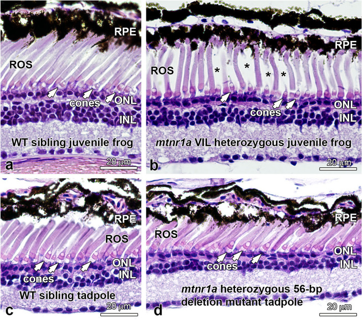 Figure 7. Heterozygous mtnr1a VIL mutant young adult (juvenile) frogs display normal rods and cones. (a) WT juvenile frogs display normal rods (ROS) and cones. (b) F1 mtnr1a VIL heterozygous mutant juvenile sibling frogs display healthy-looking rods and cones, although the ROS density appears to be lower than in WT (asterisks). Mtnr1a 56-bp deletion mutant tadpoles do not display rod dystrophy. (c) Four-month-old WT tadpole retinas and (d) F1 mtnr1a heterozygous 56-bp deletion (potential knockout) siblings exhibit healthy-appearing rods (ROS) and cones (white arrows). RPE retinal pigment epithelium, ROS rod outer segments, ONL outer nuclear layer, INL inner nuclear layer. Magnification barsâ=â20 µm. |