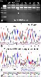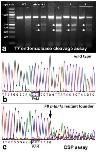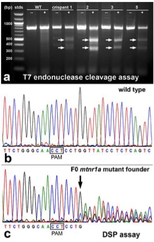 Figure S4. Genotyping assays identify adult F0 X. tropicalis sibling crispants with mtnr1a gene VIL mutations. (a) Representative T7 endonuclease I (T7EI) mismatch assay identifies mosaic F0 animals that express T2 mtnr1a indels. Denatured/reannealed amplicons are cleaved by T7E1 at the site of mismatches due to mutations in one strand, which generate DNA cleavage fragments on agarose gels. The crispants in this assay are assigned the same numbers as in supplementary figures S5 and S6, in which crispant #2 is the male founder of the F1 mtnr1a mutant progeny. All of the crispants shown here are mutants, based on the presence of PCR cleavage fragments when incubated with T7EI (+; arrows). None of the samples are cleaved in the absence of the T7E1 enzyme (--), and the DNA of normal homozygous (WT) progeny is not cleaved by T7EI (+). The image was enhanced digitally in Photoshop for contrast and brightness, and to mask some undesirable flecks of ethidium bromide precipitate. (b) Direct PCR Sanger sequencing chromatogram of WT progeny displays prominent peaks for all bases in the T2 sgRNA target area. The T2 PAM sequence (CCT) is boxed in black. (c) Direct PCR sequencing chromatogram of an F0 mosaic founder (crispant #2 in supplementary figures 5 and 6) shows pronounced sequence decomposition beginning 4-bp downstream of the T2 PAM site (arrow), representing the presence of a mixture of WT and mutant mtnr1a T2 target cDNAs from the gDNA of the mosaic tissue sample. |